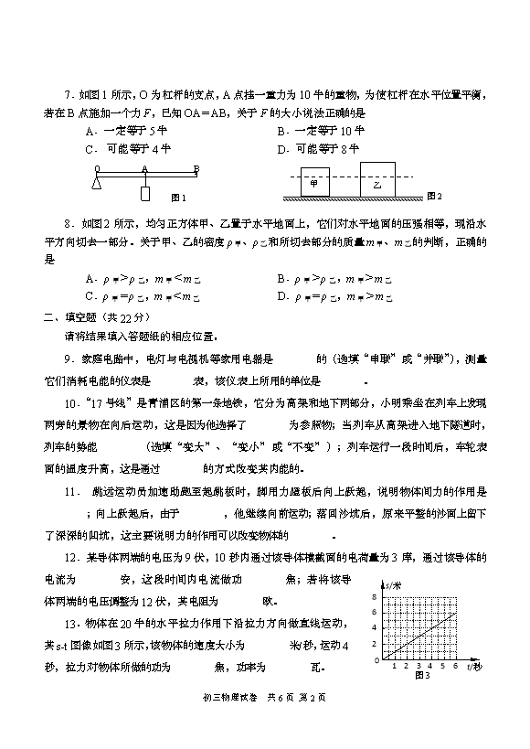 13.物体在20牛的水平拉力作用下沿拉力方向做直线运动,其s-t图像如图3所示,该物体的速度大小为米/秒,运动4秒,拉力对物体所做的功为焦,功率为瓦。