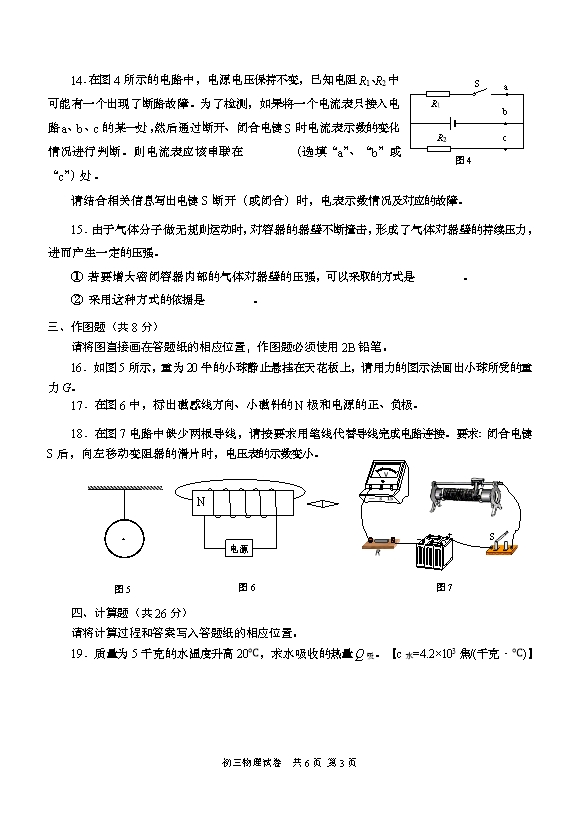 .在图4所示的电路中,电源电压保持不变,已知电阻R1、R2中可能有一个出现了断路故障。为了检测,如果将一个电流表只接入电路a、b、c的某一处,然后通过断开、闭合电键S时电流表示数的变化情况进行判断。则电流表应该串联在(选填“a”、“b”或“c”)处。