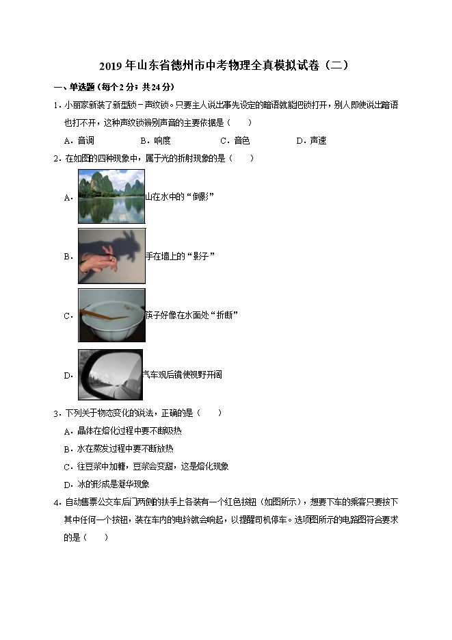 2019年山东省德州市中考物理全真模拟试卷(二)(解析版)