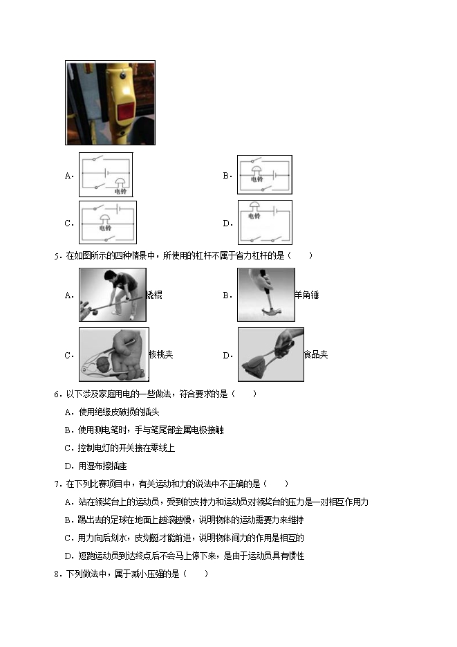 B、羊角锤在使用过程中,动力臂大于阻力臂,是省力杠杆;