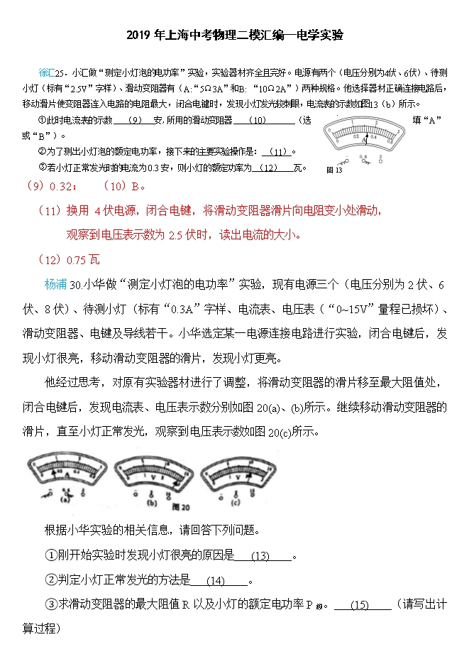 【内容简介】徐汇25.小汇做“测定小灯泡的电功率”实验,实验器材齐全且完好。电源有两个(电压分别为4伏、6伏)、待测小灯(标有“2.5V”字样)、滑动变阻器有(A:“5W 3A”和B: “10W 2A”)两种规格。他选择器材正确连接电路后,移动滑片使变阻器连入电路的电阻最大,闭合电键时,发现小灯发光较刺眼,电流表的示数如图13(b)所示。
