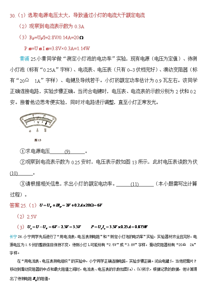 30.(1)选取电源电压太大,导致通过小灯的电流大于额定电流