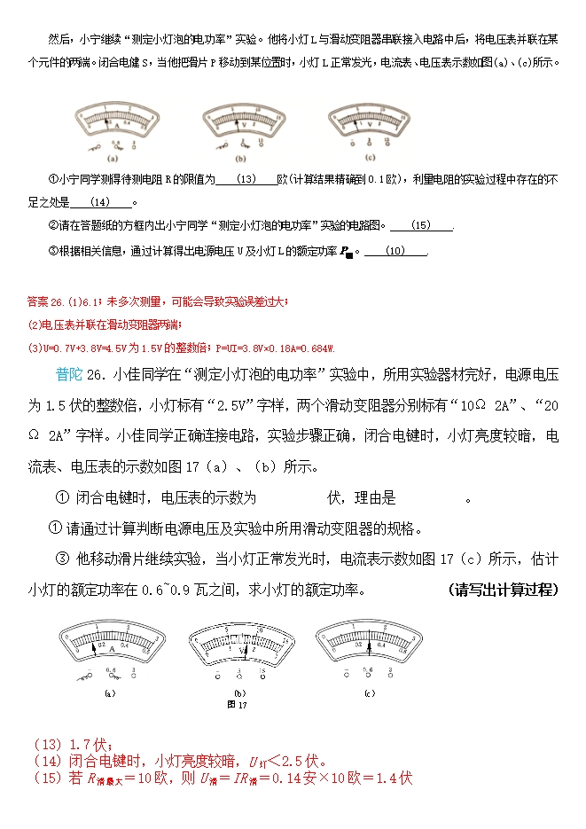 ③求滑动变阻器的最大阻值R以及小灯的额定电功率P额。 (15) (请写出计算过程)