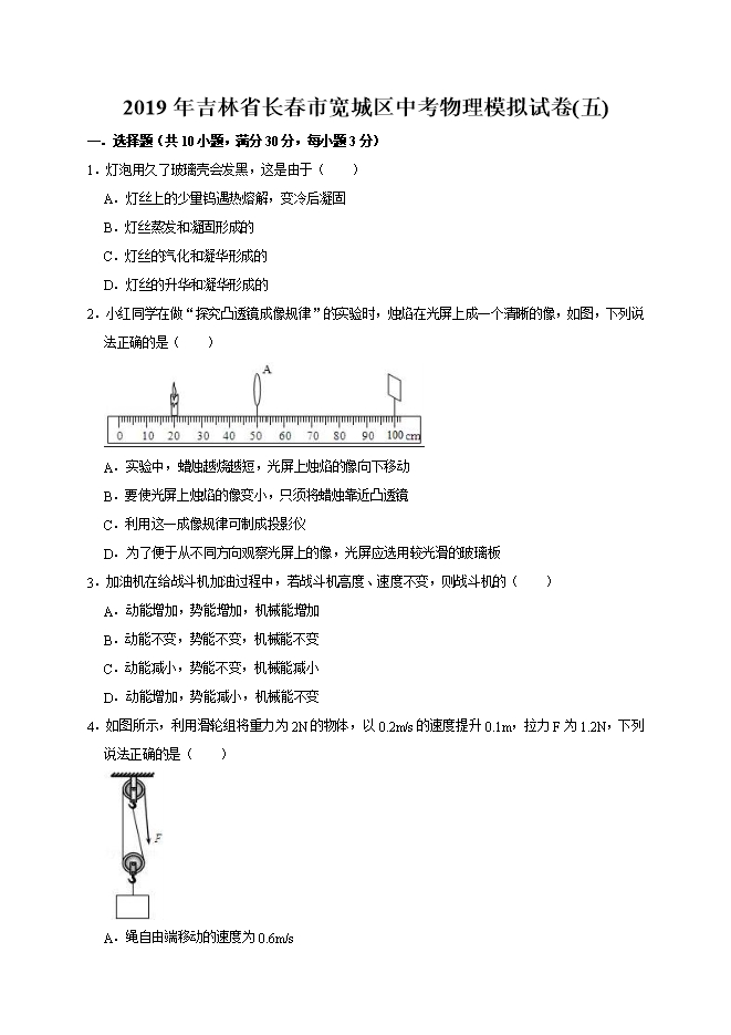 2019年吉林省长春市宽城区中考物理模拟试卷(五)(解析版)
