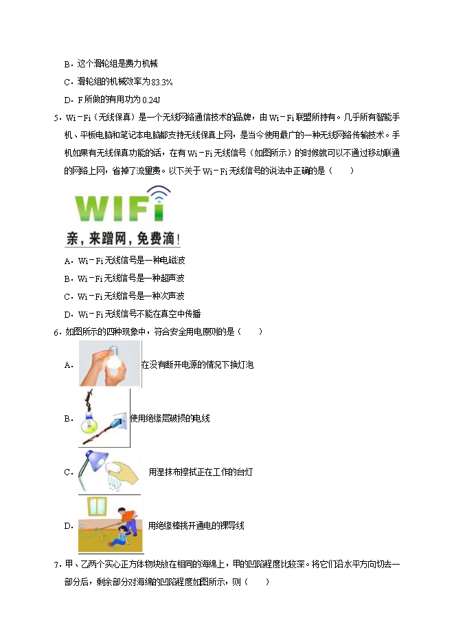 B、由题知拉力F=1.2N,G=2N,因为F<G,所以这个滑轮组是省力机械,故B错;