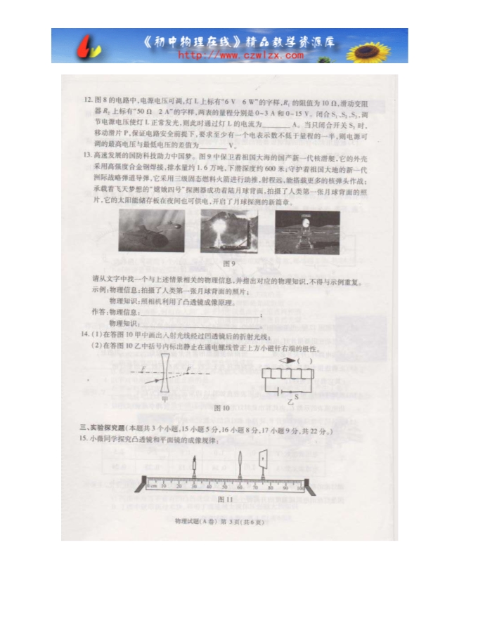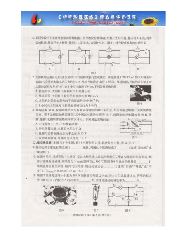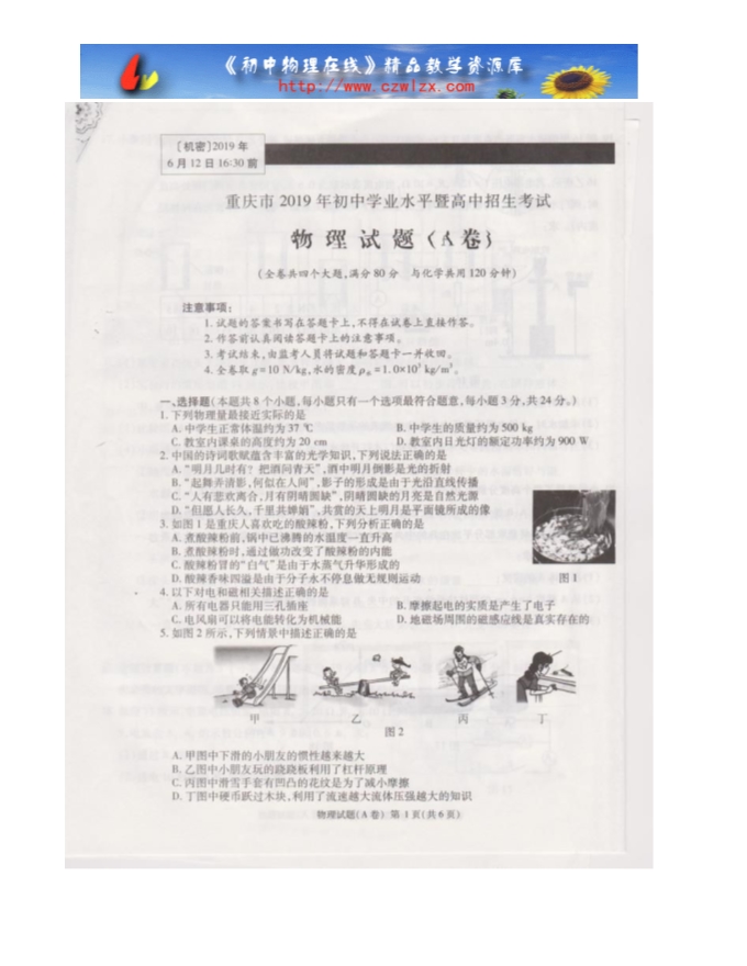 重庆市2019年初中学业水平招生考试物理试卷(A卷)(图片版无答案)