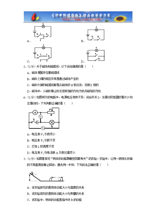 4.(3分)在小明的卧室里,同一盏吊顶灯用两个开关控制,一个安装在进门处,另一个安装在床头附近。操作任意一个开关均能独立地开灯和关灯,下面四幅图中能够满足要求的是(其中A中的S1及C中的S1,S2为单刀双掷开关)( )