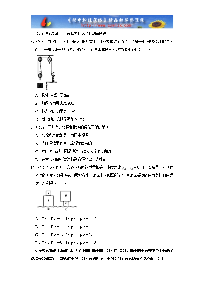 8.(3分)如图所示,用滑轮组提升重100N的物体时,在10s内绳子自由端被匀速拉下6m。已知拉绳子的力F为60N,不计绳重和摩擦,则在此过程中( )