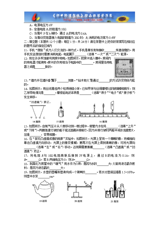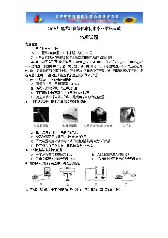 2019年黑龙江省绥化市初中毕业学业考试(中考)物理试题(word版 有答案)