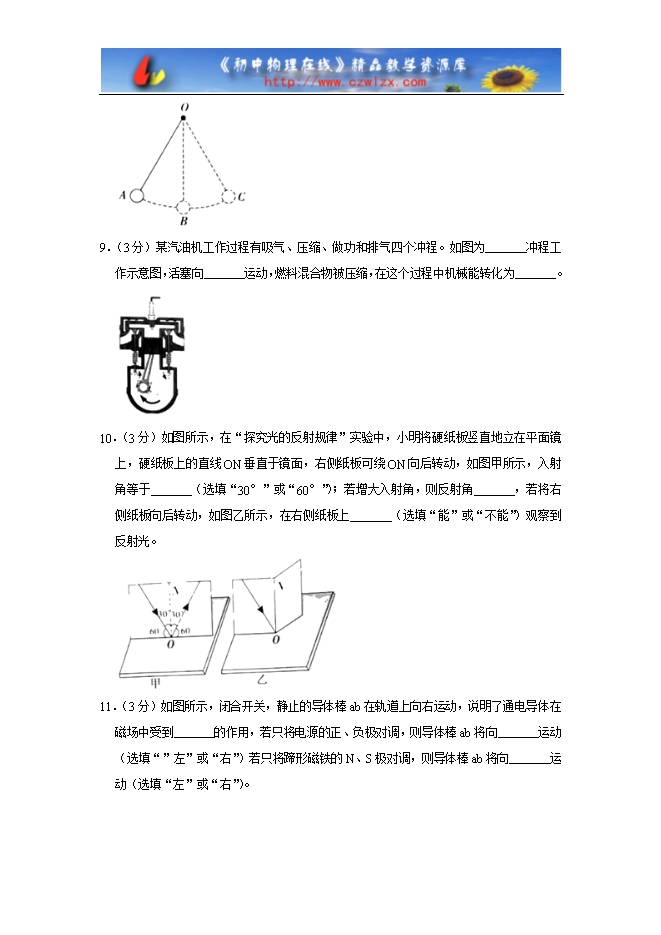 9.【解答】解:由图可知,气缸中的两个气门都关闭,活塞向上运动,燃料混合物被压缩,所以是压缩冲程;在这个过程中机械能转化为内能。