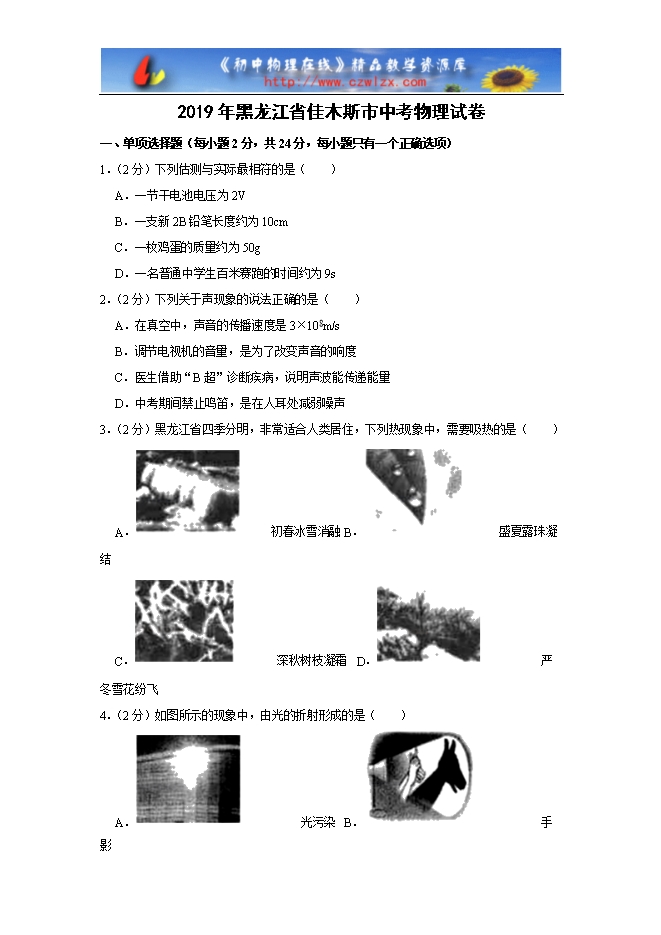 2019年黑龙江省佳木斯市中考物理试卷(word版 含答案)