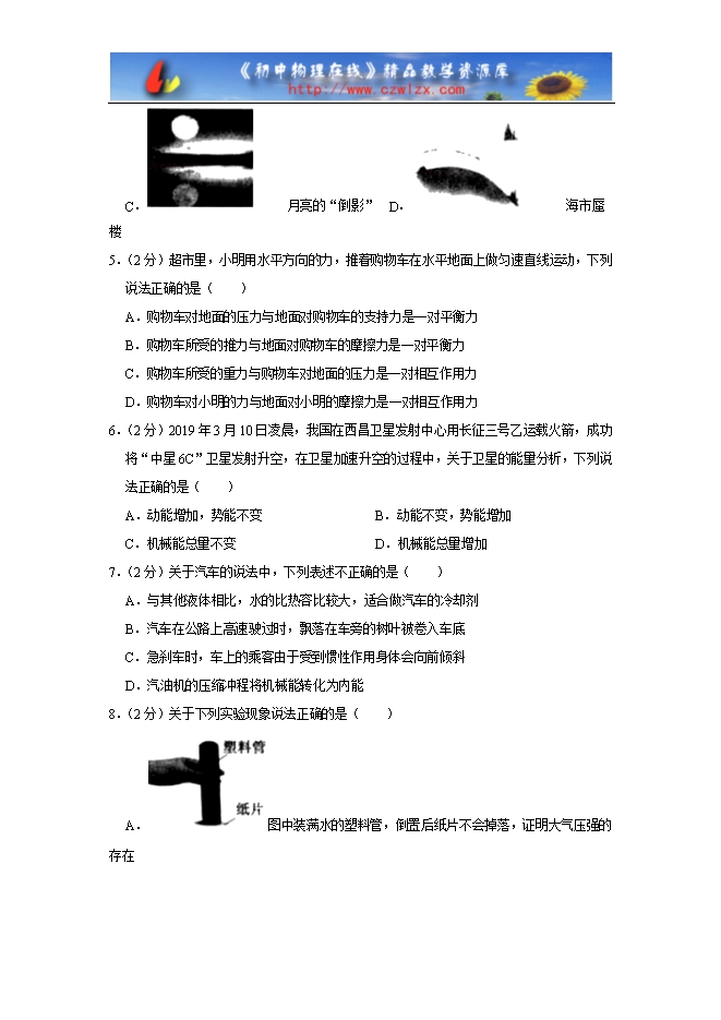 6.(2分)2019年3月10日凌晨,我国在西昌卫星发射中心用长征三号乙运载火箭,成功将“中星6C”卫星发射升空,在卫星加速升空的过程中,关于卫星的能量分析,下列说法正确的是( )