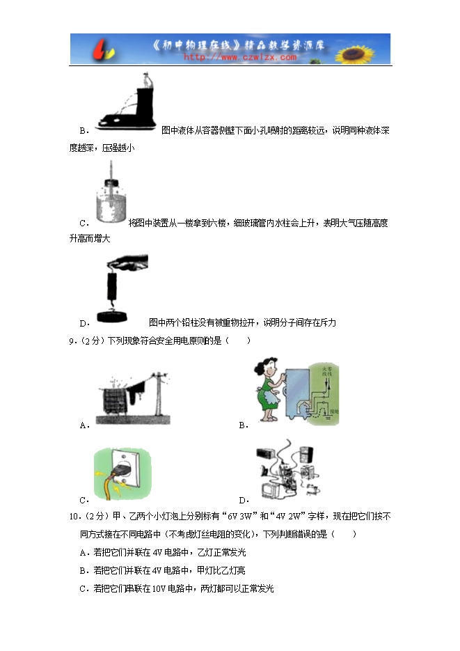 10.(2分)甲、乙两个小灯泡上分别标有“6V 3W”和“4V 2W”字样,现在把它们按不同方式接在不同电路中(不考虑灯丝电阻的变化),下列判断错误的是( )