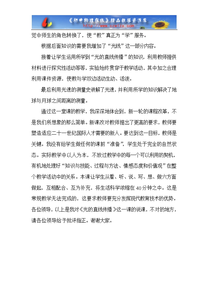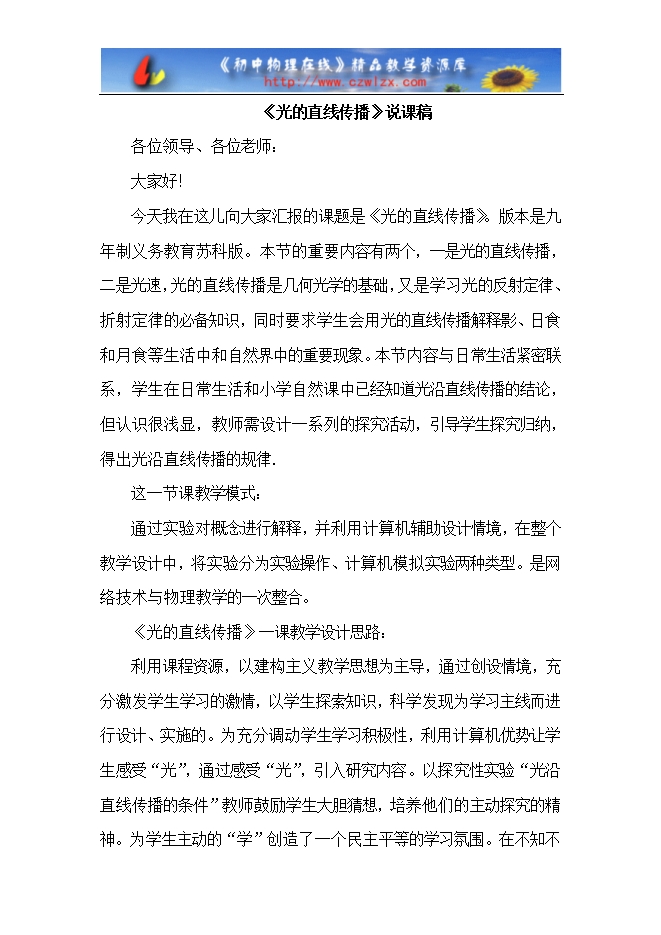 今天我在这儿向大家汇报的课题是《光的直线传播》。版本是九年制义务教育苏科版。本节的重要内容有两个,一是光的直线传播,二是光速,光的直线传播是几何光学的基础,又是学习光的反射定律、折射定律的必备知识,同时要求学生会用光的直线传播解释影、日食和月食等生活中和自然界中的重要现象。本节内容与日常生活紧密联系,学生在日常生活和小学自然课中已经知道光沿直线传播的结论,但认识很浅显,教师需设计一系列的探究活动,引导学生探究归纳,得出光沿直线传播的规律.