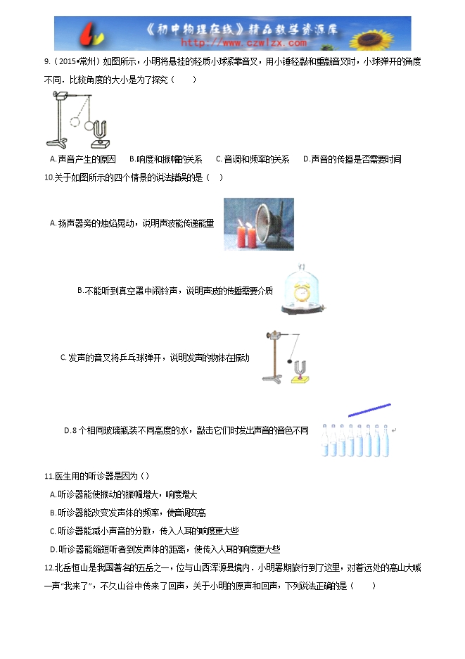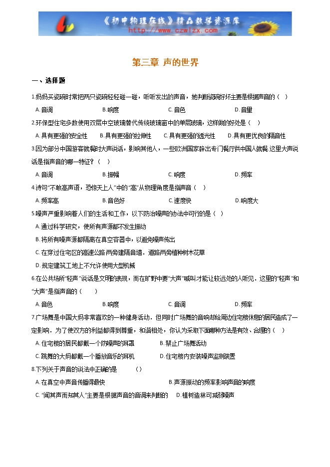 【内容简介】1.妈妈买瓷碗时常把两只瓷碗轻轻碰一碰,听听发出的声音,她判断瓷碗好坏主要是根据声音的( ) A. 音调 B. 响度 C. 音色 D. 音量2.环保型住宅多数使用双层中空玻璃替代传统玻璃窗中的单层玻璃,这样做的好处是( ) A. 具有更强的安全性 B. 具有更强的拉伸性 C. 具有更强的透光性 D. 具有更优良的隔音性3.因为部分中国游客就餐时大声说话,影响其他人,一些欧洲国家辟出专门餐厅供中国人就餐.这里大声说话是指声音的哪一特征?( ) A. 音调 B. 振幅 C. 响度 D. 频率4.诗句“不敢高声语,恐惊天上人”中的“高”从物理角度是指声音( ) A. 频率高 B. 音色好 C. 速度快 D. 响度大