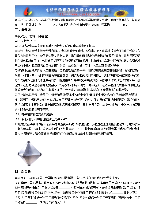 【内容简介】3月1日16时13分,我国首颗探月卫星“嫦娥一号”在完成任务以后实行“受控撞月”.(1)嫦娥一号卫星是在北京航天飞行控制中心科技人员的精确控制下,准确落于月球东经52.36度、南纬1.50度的预定撞击点.科技人员是靠________ (填“电磁波”或“超声波”)传递信息来精确控制卫星的.探月卫星距地球指挥中心约为3.9×105km,地球指挥中心向探月卫星发射的指令,经________ 秒到达卫星.(2)为了保证“嫦娥一号”卫星成功“受控撞月”,15时36分,嫦娥一号卫星开始减速.减速过程中,卫星的动能将________ (填“减小”或“增大”);