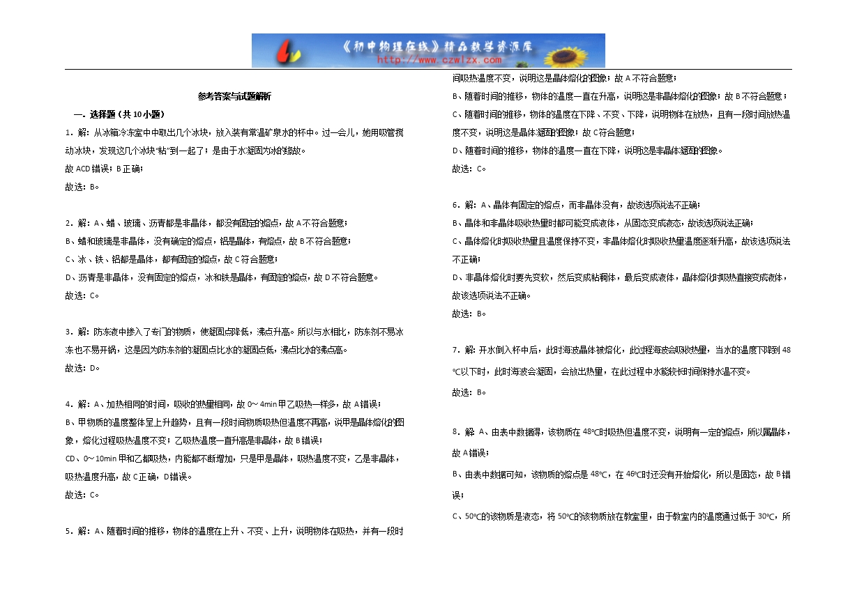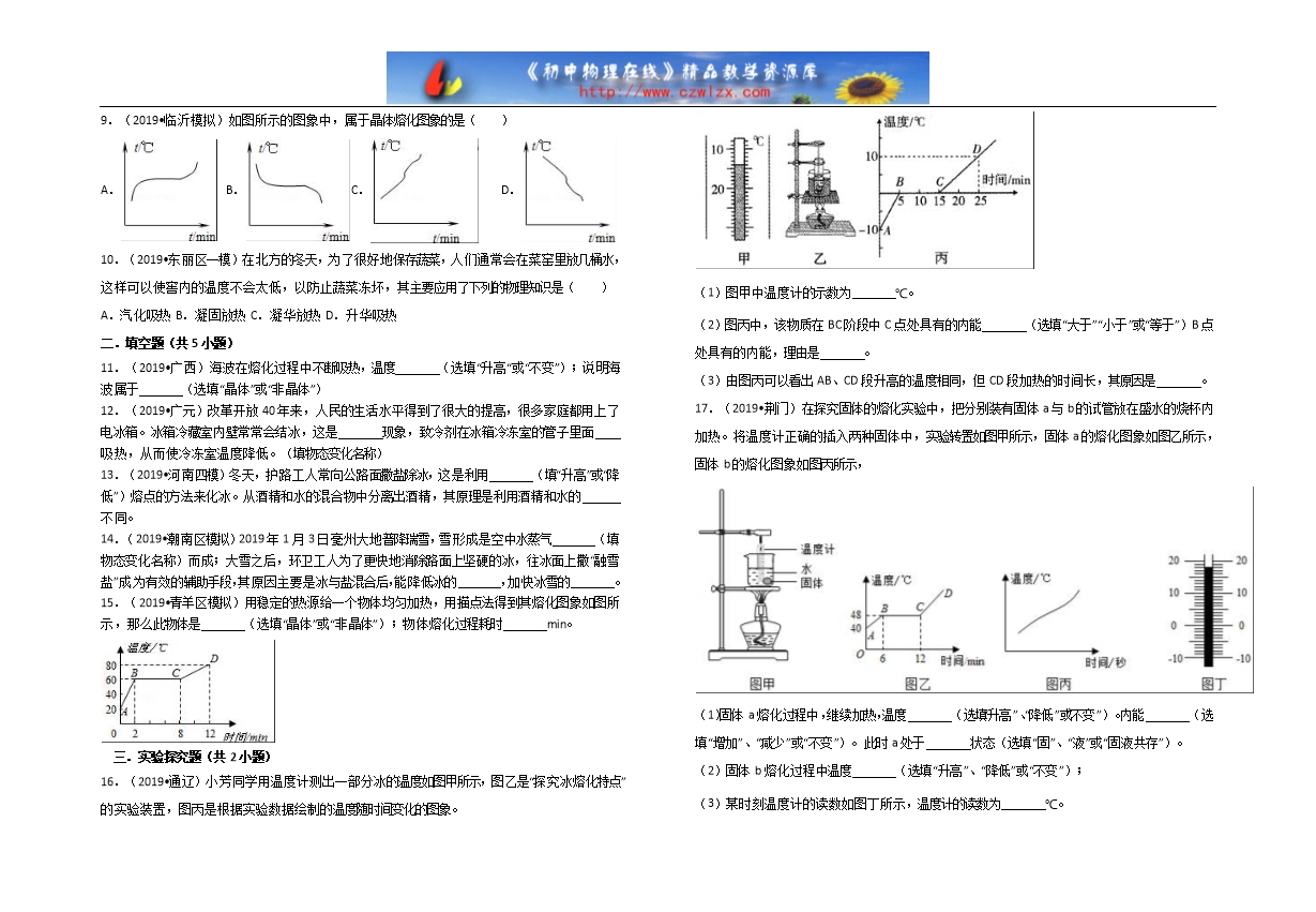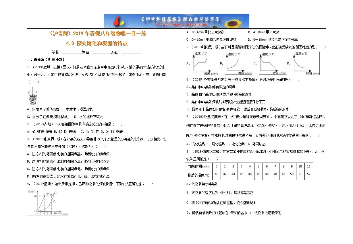 【内容简介】一.选择题(共10小题)1.(2019•肥城市三模)夏天,莉莉从冰箱冷冻室中中取出几个冰块,放入装有常温矿泉水的杯中。过一会儿,她用吸管搅动冰块,发现这几个冰块“粘”到一起了,如图所示,其主要原因是( )A.水发生了凝华现象 B.水发生了凝固现象C.水分子在做无规则运动动 D.水的比热容较大2.(2019•赤峰)下列各组固体中具有确定熔点的一组是( )A.蜡玻璃沥青 B.蜡铝玻璃 C.冰铁铝 D.冰铁沥青3.(2019•张家界一模)在严寒的冬天,需要排尽汽车水箱里的水并注入防冻剂。与水相比,防冻剂不易冰冻也不易开锅(沸腾),这是因为( )A.防冻剂的凝固点比水的凝固点高,沸点比水的沸点低B.防冻剂的凝固点比水的凝固点高,沸点比水的沸点高C.防冻剂的凝固点比水的凝固点低,沸点比水的沸点低D.防冻剂的凝固点比水的凝固点低,沸点比水的沸点高4.(2019•扬州)如图所示是甲、乙两种物质的熔化图象,下列说法正确的是( )