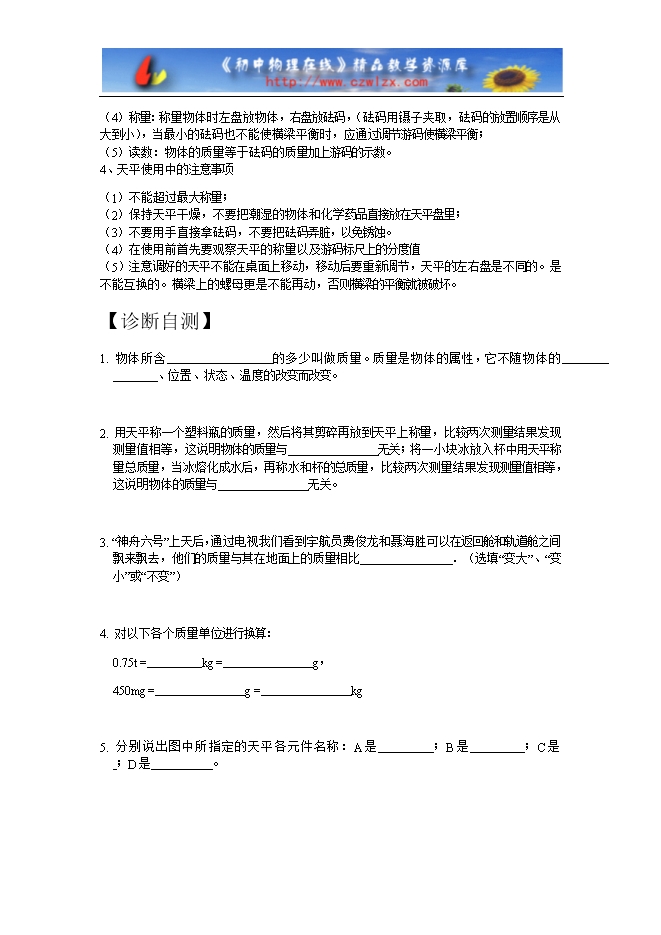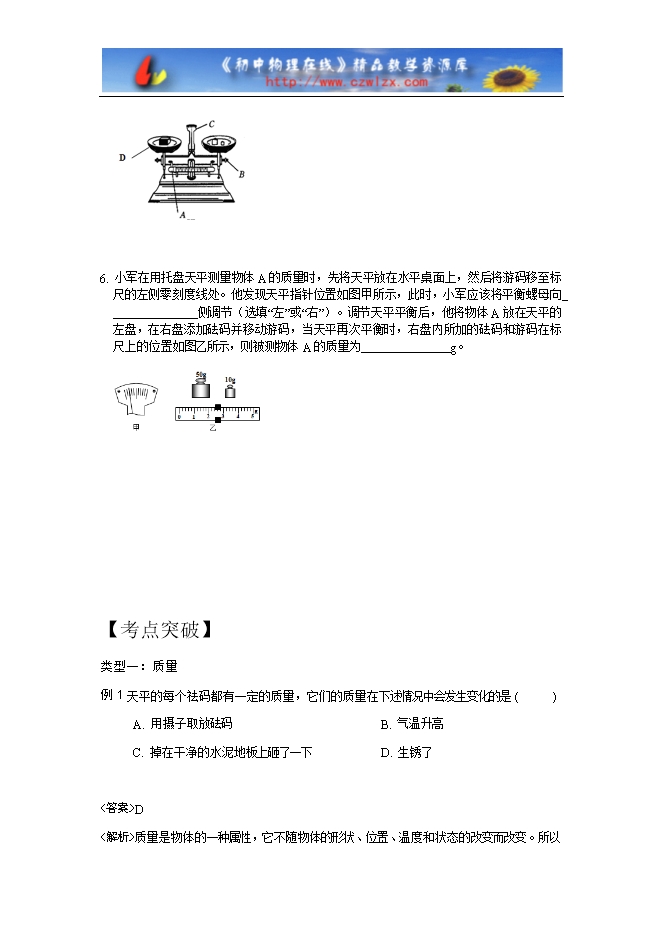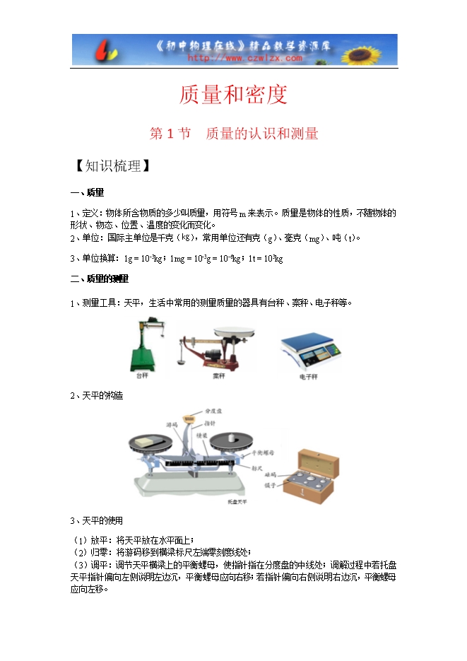 【内容简介】【知识梳理】一、质量1、定义:物体所含物质的多少叫质量,用符号m来表示。质量是物体的性质,不随物体的形状、物态、位置、温度的变化而变化。 2、单位:国际主单位是千克(㎏),常用单位还有克(g)、毫克(mg)、吨(t)。3、单位换算:1g = 10-3kg;1mg = 10-3g = 10-6kg;1t = 103kg二、质量的测量1、测量工具:天平,生活中常用的测量质量的器具有台秤、案秤、电子秤等。2、天平的构造3、天平的使用(1)放平:将天平放在水平面上;(2)归零:将游码移到横梁标尺左端零刻度线处;(3)调平:调节天平横梁上的平衡螺母,使指针指在分度盘的中线处;调解过程中若托盘天平指针偏向左侧说明左边沉,平衡螺母应向右移;若指针偏向右侧说明右边沉,平衡螺母应向左移。(4)称量:称量物体时左盘放物体,右盘放砝码,(砝码用镊子夹取,砝码的放置顺序是从大到小),当最小的砝码也不能使横梁平衡时,应通过调节游码使横梁平衡;(5)读数:物体的质量等于砝码的质量加上游码的示数。 4、天平使用中的注意事项(1)不能超过最大称量;(2)保持天平干燥,不要把潮湿的物体和化学药品直接放在天平盘里;(3)不要用手直接拿砝码,不要把砝码弄脏,以免锈蚀。(4)在使用前首先要观察天平的称量以及游码标尺上的分度值(5)注意调好的天平不能在桌面上移动,移动后要重新调节,天平的左右盘是不同的。是不能互换的。横梁上的螺母更是不能再动,否则横梁的平衡就被破坏。
