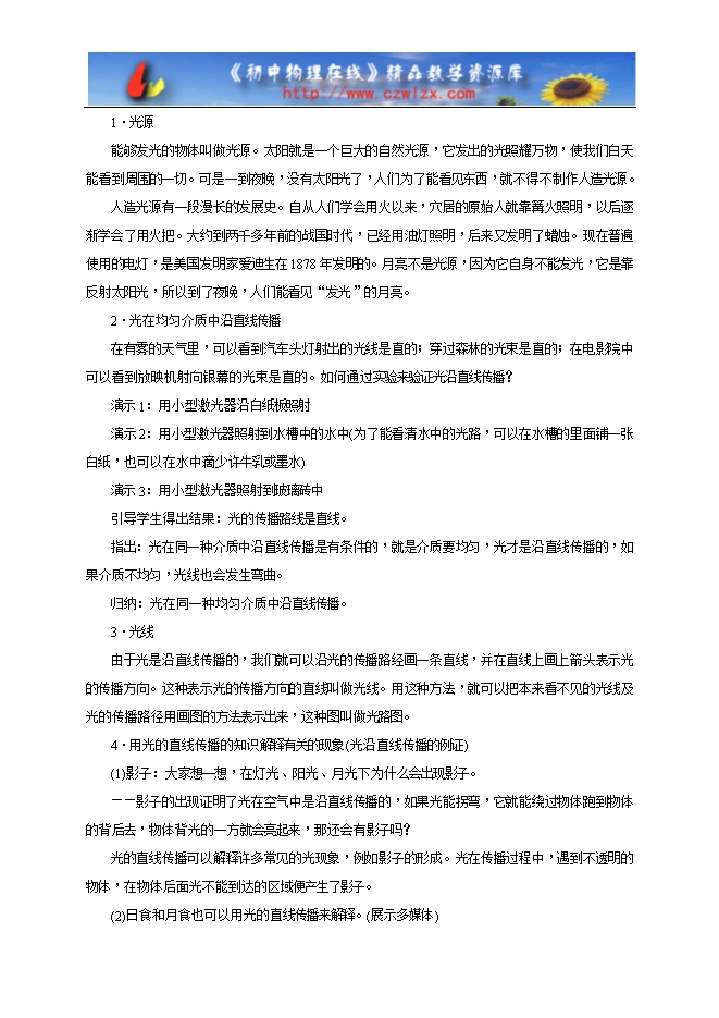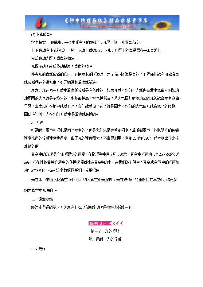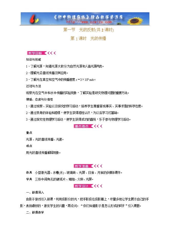 【内容简介】第一节 光的反射(共2课时)第1课时 光的传播 知识与技能1.了解光源,知道光源大致分为自然光源和人造光源两类。2.理解光沿直线传播及其应用。3.了解光在真空和空气中的传播速度c=3×108 m/s。过程与方法观察光在空气中和水中传播的实验现象,了解实验是研究物理问题的重要方法。情感、态度与价值观1.通过观察、实验以及探究的学习活动,培养学生尊重客观事实、实事求是的科学态度。2.通过亲身的体验和感悟,使学生获得感性认识,为以后学习打基础。3.通过探究性物理学习活动,使学生获得成功的喜悦,乐于参与物理学习活动。重点光源、光的直线传播、光速。难点用光的直线传播解释现象。 教具 小型激光器、水槽(水)、玻璃砖、光屏、日食、月食的多媒体课件。学具 三张中间有孔的硬纸片、蜡烛、火柴、光屏。一、新课导入由影子游戏引入新课,利用投影仪的光,把手影投在投影幕上,尽量多地让学生展示自己的手影,表扬最好的,激发学生的兴趣,再设问:“你们知道影子是怎么形成的吗?”引入课题。二、新课教学