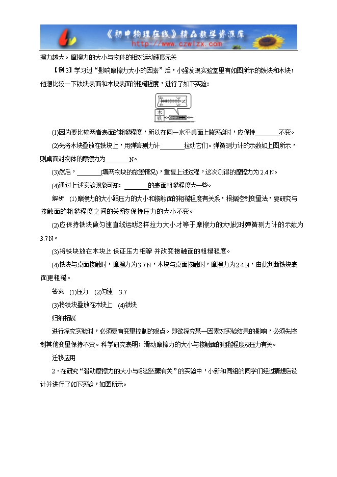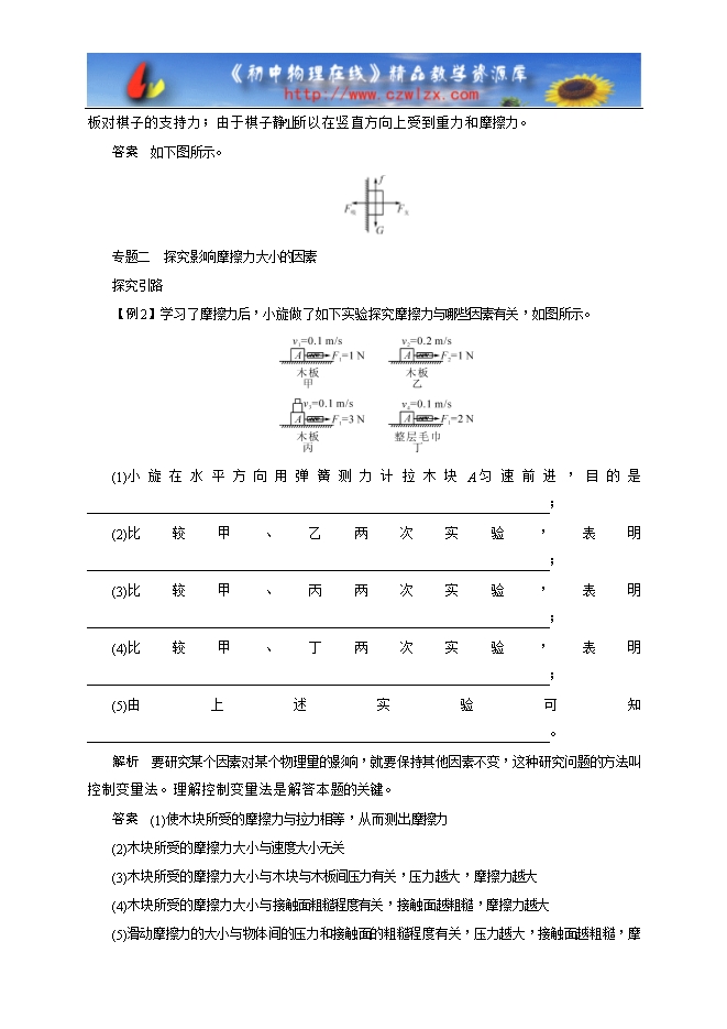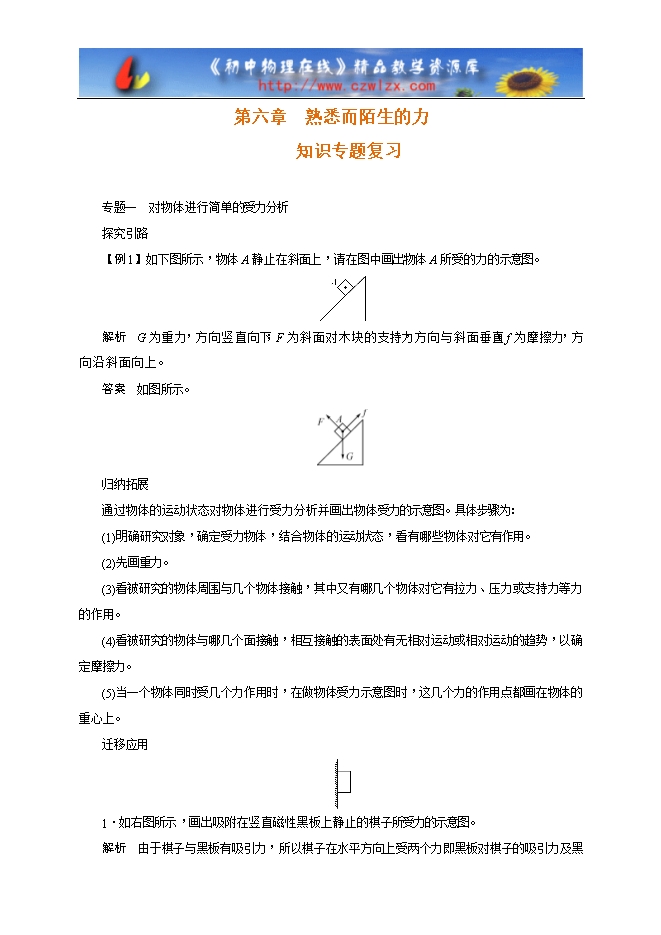 【内容简介】专题一 对物体进行简单的受力分析探究引路【例1】如下图所示,物体A静止在斜面上,请在图中画出物体A所受的力的示意图。解析 G为重力,方向竖直向下;F为斜面对木块的支持力,方向与斜面垂直;f为摩擦力,方向沿斜面向上。答案 如图所示。归纳拓展通过物体的运动状态对物体进行受力分析并画出物体受力的示意图。具体步骤为:(1)明确研究对象,确定受力物体,结合物体的运动状态,看有哪些物体对它有作用。(2)先画重力。(3)看被研究的物体周围与几个物体接触,其中又有哪几个物体对它有拉力、压力或支持力等力的作用。(4)看被研究的物体与哪几个面接触,相互接触的表面处有无相对运动或相对运动的趋势,以确定摩擦力。(5)当一个物体同时受几个力作用时,在做物体受力示意图时,这几个力的作用点都画在物体的重心上。迁移应用