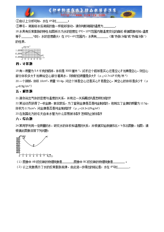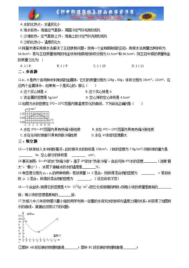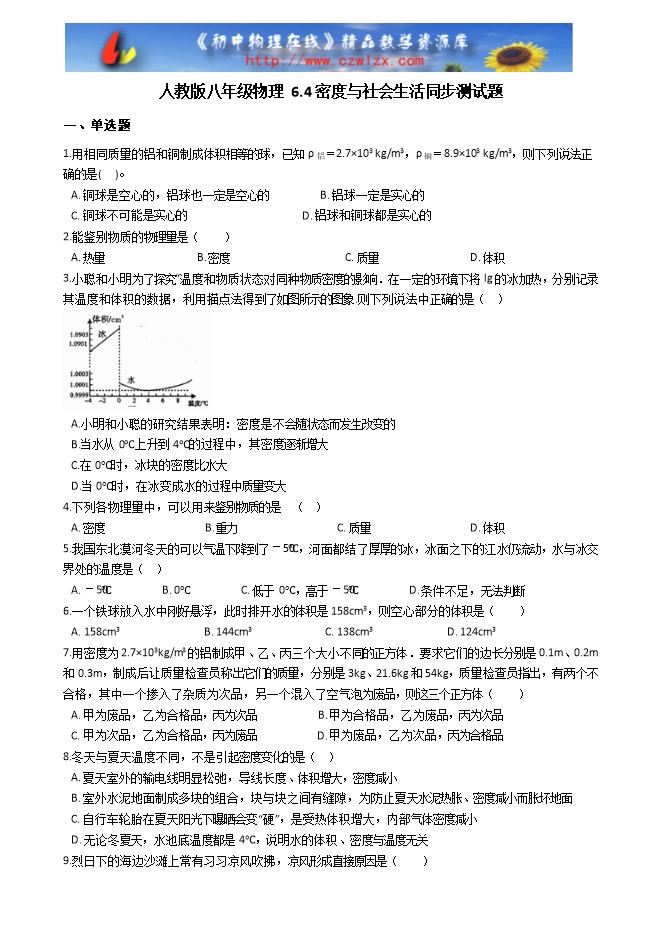 【内容简介】一、单选题1.用相同质量的铝和铜制成体积相等的球,已知ρ铝=2.7×103 kg/m3,ρ铜=8.9×103 kg/m3,则下列说法正确的是( )。A. 铜球是空心的,铝球也一定是空心的 B. 铝球一定是实心的 C. 铜球不可能是实心的 D. 铝球和铜球都是实心的2.能鉴别物质的物理量是( )A. 热量 B. 密度 C. 质量 D. 体积3.小聪和小明为了探究“温度和物质状态对同种物质密度的影响.在一定的环境下将lg的冰加热,分别记录其温度和体积的数据,利用描点法得到了如图所示的图象.则下列说法中正确的是( )
