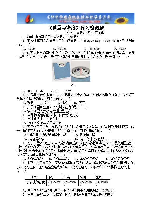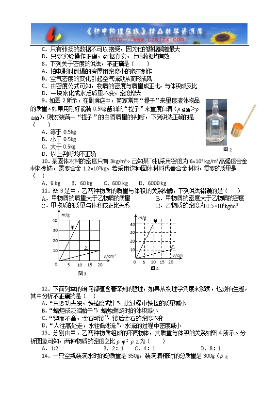 【内容简介】3.对餐具进行高温消毒时,把餐具放进冷水直至加热到水沸腾的过程中,下列关于餐具的物理量没有发生变化的是( )A.温度 B.质量 C.体积 D.密度4.关于质量和密度,下列说法正确的是( )A.物体质量的大小与地理位置无关B.同种物质组成的物体,体积大的密度小C.冰熔化成水,密度变小D.物质的密度与质量成正比5.天平调节好之后,在称物体质量时,右盘已放入砝码,游码也已经移到了某一位置,这时发现指针在分度盘中线的左侧少许,正确的操作应是( ) A.将右盘中的砝码换得小一些 B.将游码左移C.将游码右移 D.将平衡螺母向左调6.为了测盐水的密度,某实验小组制定如下的实验计划:①在烧杯中装入适量盐水,测出它们的总质量;②将烧杯中一部分盐水倒入量筒中;③测出量筒中盐水的体积;④测出烧杯和剩余盐水的质量;⑤测出空烧杯的质量;⑥根据实验数据计算盐水的密度。以上实验步骤安排最合理的是( )A.①②③④⑥ B.⑤①②③⑥ C.①②④③⑤⑥ D.⑤①②④③⑥