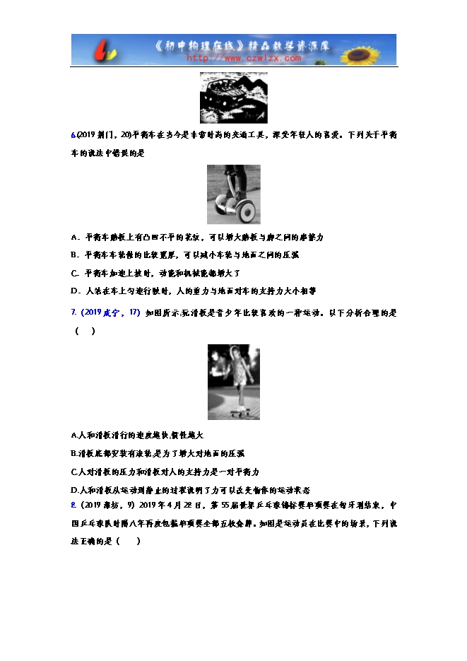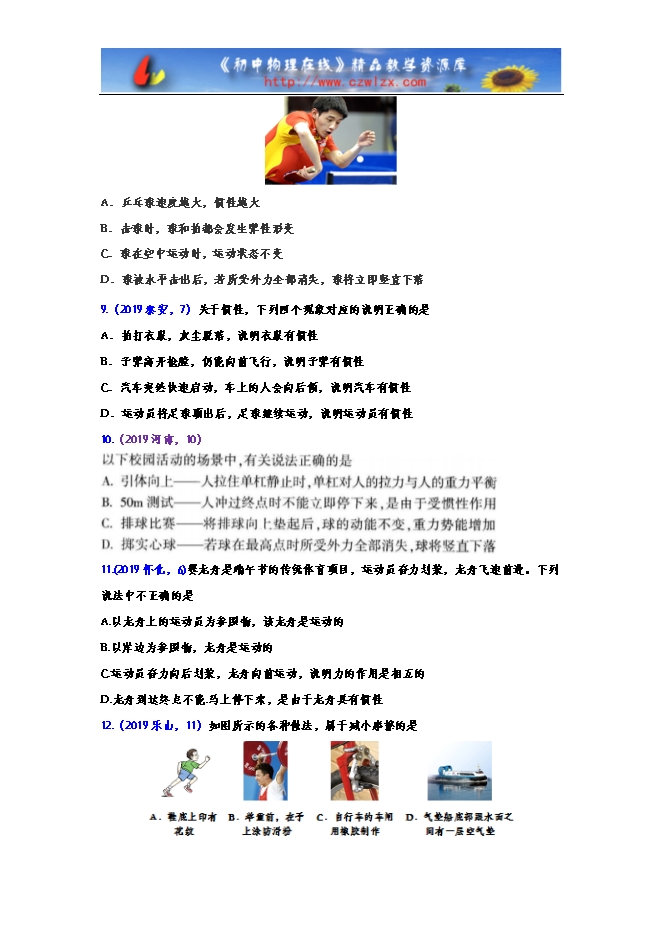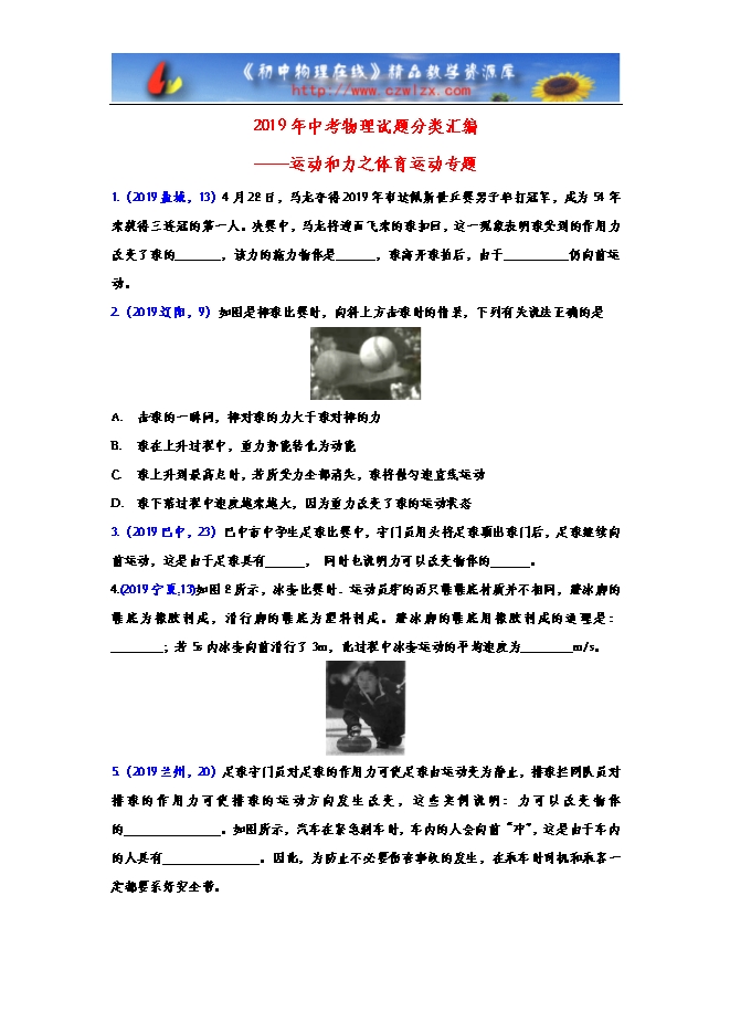 【内容简介】1.(2019盐城,13)4月28日,马龙夺得2019年布达佩斯世乒赛男子单打冠军,成为54年来获得三连冠的第一人。决赛中,马龙将迎面飞来的球扣回,这一现象表明球受到的作用力改变了球的_______,该力的施力物体是______,球离开球拍后,由于__________仍向前运动。 2.(2019辽阳,9)如图是棒球比赛时,向斜上方击球时的情景,下列有关说法正确的是 A. 击球的一瞬间,棒对球的力大于球对棒的力 B. 球在上升过程中,重力势能转化为动能 C. 球上升到最高点时,若所受力全部消失,球将做匀速直线运动 D. 球下落过程中速度越来越大,因为重力改变了球的运动状态3.(2019巴中,23)巴中市中学生足球比赛中,守门员用头将足球顶出球门后,足球继续向前运动,这是由于足球具有 , 同时也说明力可以改变物体的 。4.(2019宁夏,13)如图8所示,冰壶比赛时.运动员穿的两只鞋鞋底材质并不相同,蹬冰脚的鞋底为橡胶制成,滑行脚的鞋底为塑料制成。蹬冰脚的鞋底用橡胶制成的道理是:________;若5s内冰壶向前滑行了3m,此过程中冰壶运动的平均速度为________m/s。5.(2019兰州,20)足球守门员对足球的作用力可使足球由运动变为静止,排球拦网队员对排球的作用力可使排球的运动方向发生改变,这些实例说明:力可以改变物体的 。如图所示,汽车在紧急刹车时,车内的人会向前“冲”,这是由于车内的人具有 。因此,为防止不必要伤害事故的发生,在乘车时司机和乘客一定都要系好安全带。