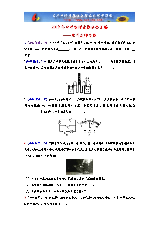 【内容简介】1.(2019福建,19)一台标有“5V 2.5W”的带有USB接口的小电风扇,线圈电阻为1Ω,正常丁作1min,产生的热量是 Jo工作一段时间后的风扇叶片黏有不少灰尘,这属于 现象。2.(2019绥化,21)如图所示是探究电流通过导体时产生的热量与 关系的实验装置。通电一段时间,左侧容器和右侧容器中的电阻丝产生的热量之比为 。3.(2019宜宾,12)如图甲所示电路中,已知定值电阻R1=20Ω。开关闭合后,两个完全相同的电流表 A1、A2指针均指在同一位置,如图乙所示,则此时通过R1的电流为________A,在10s内R2产生的热量为________J。4.(2019辽阳,25)阳阳做了如图所示的一个实验,将一个两端开口的玻璃管的下端靠近乒气球,管的上端用一个电吹风对着管口水平吹风,发现乒乓球沿着玻璃管向上运动,并从管口飞出,请回答下列问题:(1)乒乓球沿着玻璃管向上运动,是利用了流体压强的什么特点?(2)电吹风中的电动机工作时,主要的能量转化是什么?(3)电吹风吹热风时,电热丝的发热原理是什么?5.(2019湘潭,18)如图是一把既能吹冷风、又能吹热风的简化电路图,其中M是吹风机,R是电热丝。由电路图可知( )