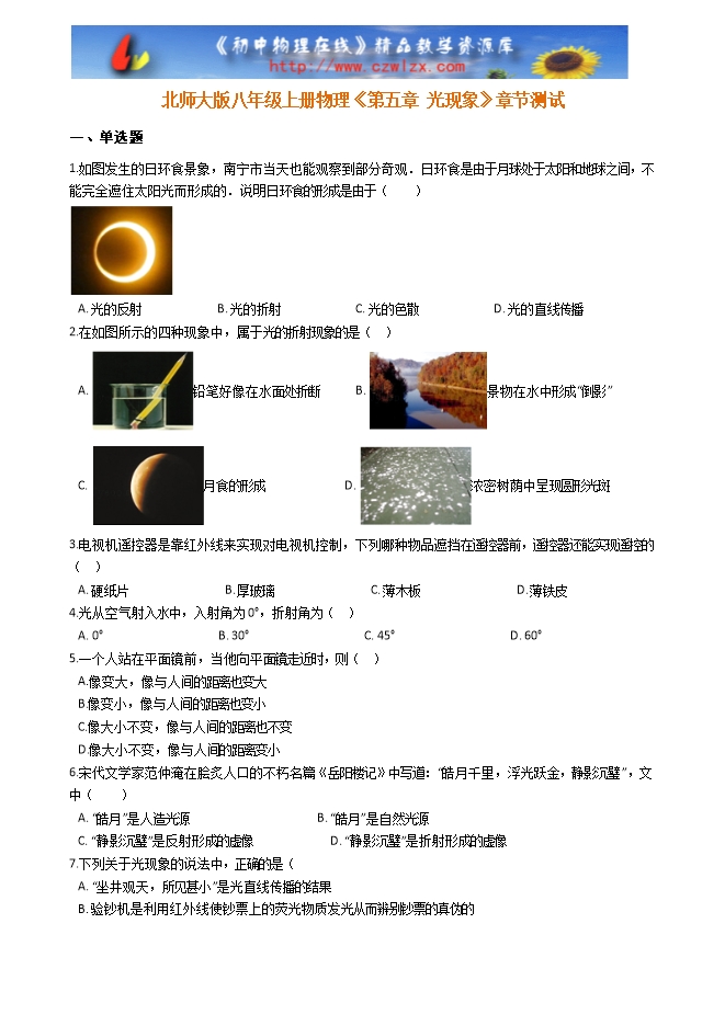 北师大版八年级上册物理《第五章 光现象》章节测试及答案