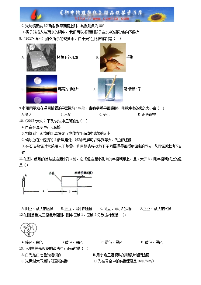 【内容简介】5.一个人站在平面镜前,当他向平面镜走近时,则( )A.像变大,像与人间的距离也变大 B.像变小,像与人间的距离也变小 C.像大小不变,像与人间的距离也不变 D.像大小不变,像与人间的距离变小6.宋代文学家范仲淹在脍炙人口的不朽名篇《岳阳楼记》中写道:“皓月千里,浮光跃金,静影沉璧”,文中( )A. “皓月”是人造光源 B. “皓月”是自然光源 C. “静影沉璧”是反射形成的虚像 D. “静影沉璧”是折射形成的虚像7.下列关于光现象的说法中,正确的是( A. “坐井观天,所见甚小”是光直线传播的结果 B. 验钞机是利用红外线使钞票上的荧光物质发光从而辨别钞票的真伪的