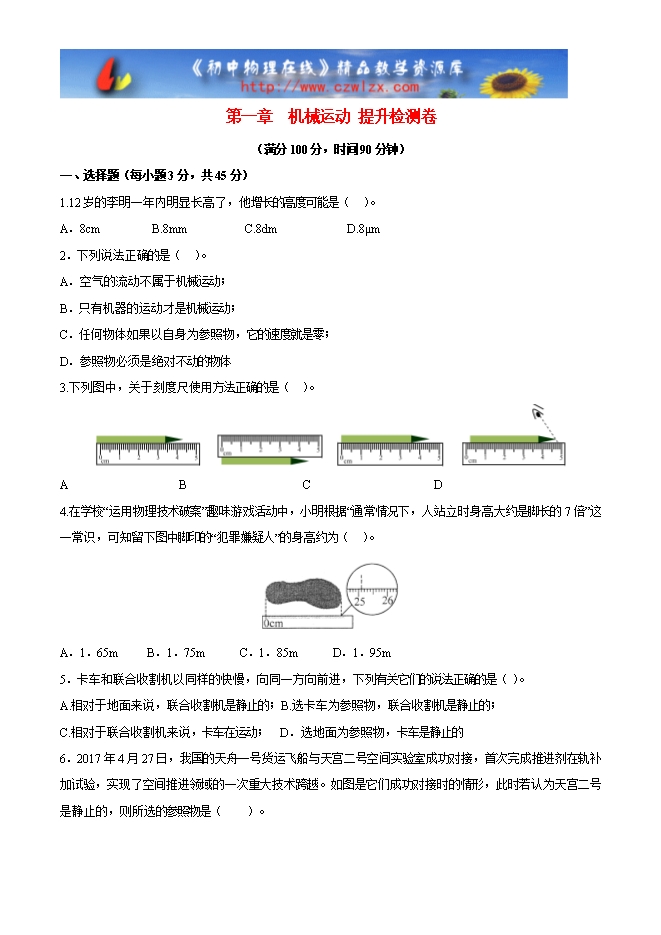 【内容简介】一、选择题(每小题3分,共45分)1.12岁的李明一年内明显长高了,他增长的高度可能是( )。A.8cm B.8mm C.8dm D.8μm2.下列说法正确的是( )。A.空气的流动不属于机械运动;B.只有机器的运动才是机械运动;C.任何物体如果以自身为参照物,它的速度就是零;D.参照物必须是绝对不动的物体3.下列图中,关于刻度尺使用方法正确的是( )。 A B C D4.在学校“运用物理技术破案”趣味游戏活动中,小明根据“通常情况下,人站立时身高大约是脚长的7倍”这一常识,可知留下图中脚印的“犯罪嫌疑人”的身高约为( )。A.1.65m B.1.75m C.1.85m D.1.95m5.卡车和联合收割机以同样的快慢,向同一方向前进,下列有关它们的说法正确的是( )。A.相对于地面来说,联合收割机是静止的;B.选卡车为参照物,联合收割机是静止的;C.相对于联合收割机来说,卡车在运动; D.选地面为参照物,卡车是静止的6.2017年4月27日,我国的天舟一号货运飞船与天宫二号空间实验室成功对接,首次完成推进剂在轨补加试验,实现了空间推进领域的一次重大技术跨越。如图是它们成功对接时的情形,此时若认为天宫二号是静止的,则所选的参照物是( )。