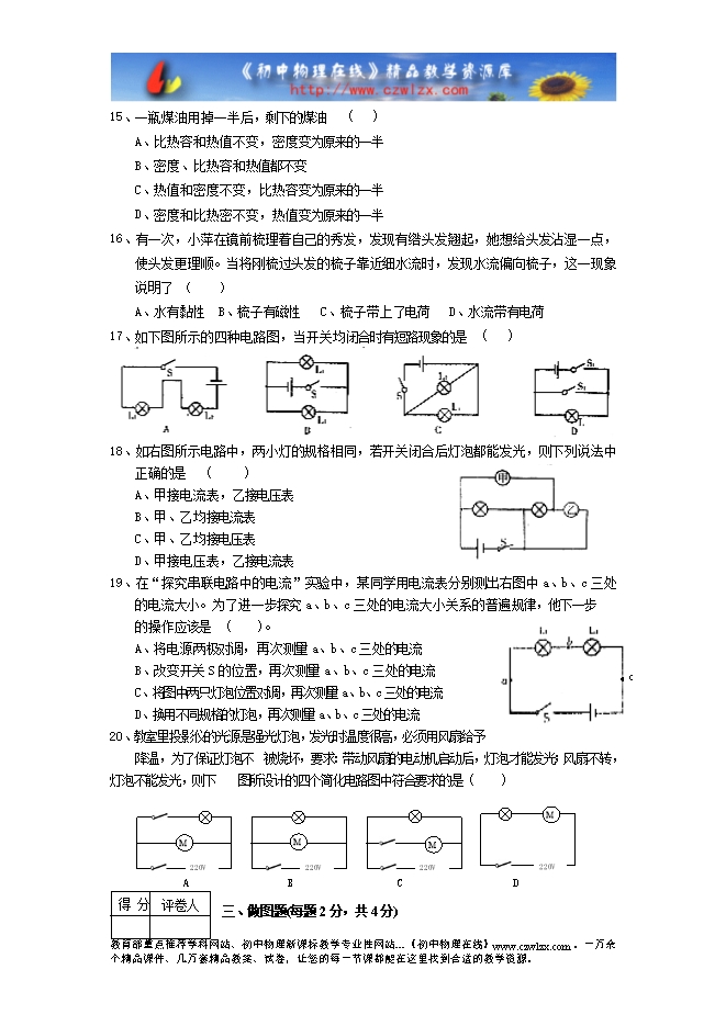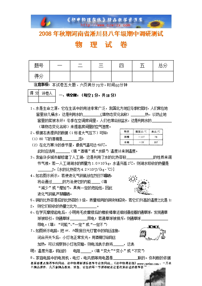 2008年秋期河南省淅川县九年级期中调研测试物理试卷及答案(上科版)