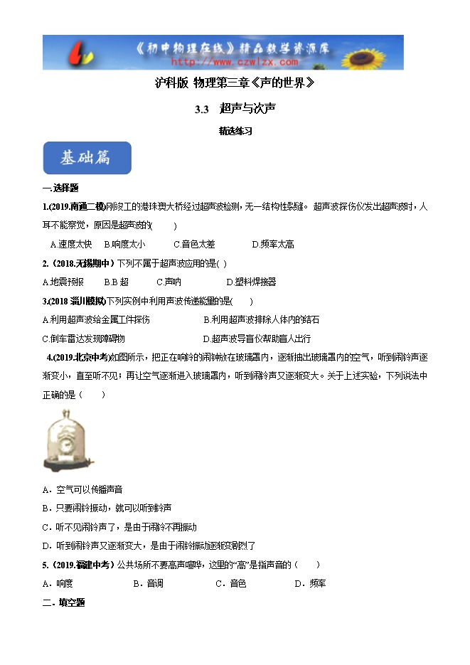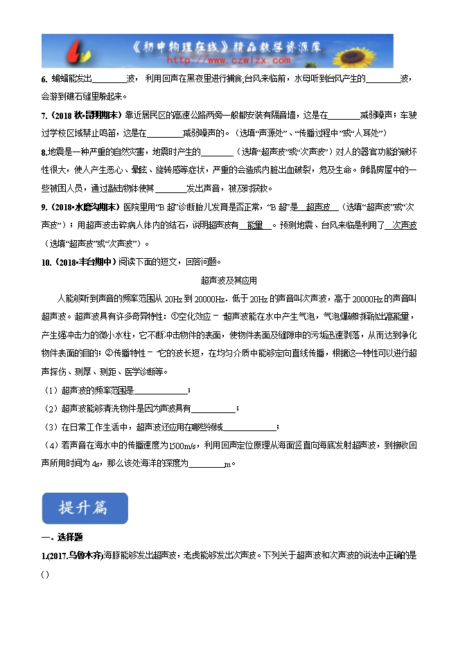 - 9142022-2023学年度沪科版八年级物理培优练习:3.3超声与次声(附答案)