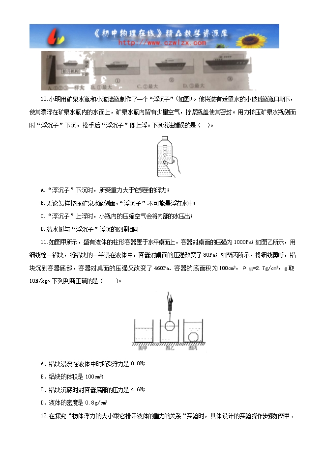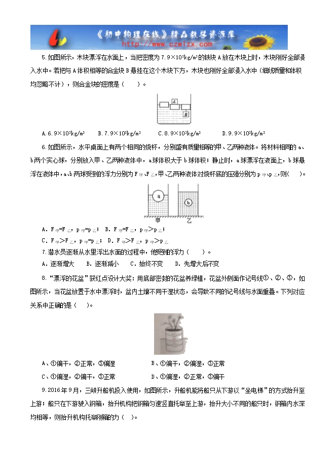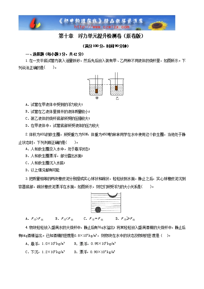 【内容简介】一、选择题(每小题3分,共42分)1.在一支平底试管内装入适量铁砂,然后先后放入装有甲、乙两种不同液体的烧杯里,如图所示。下列说法正确的是( )。A.试管在甲液体中受到的浮力较大;B.试管在乙液体里排开的液体质量较小;C.装乙液体的烧杯底部所受的压强较大;D.在甲液体中,试管底部所受液体的压力较大2.体积为60L的救生圈,所受重力为50N,体重为450N的林林同学在水中使用这个救生圈,当他处于静止状态时,下列判断正确的是( )。A.人和救生圈没入水中,处于悬浮状态;B.人和救生圈漂浮,部分露出水面;C.人和救生圈沉入水底;D.以上情况都有可能3.把质量相等的两块橡皮泥分别捏成实心球状和碗状,轻轻放到水面,静止之后,实心球橡皮泥沉到容器底部,碗状橡皮泥漂浮在水面,如图所示,则它们所受浮力的大小关系是( )。