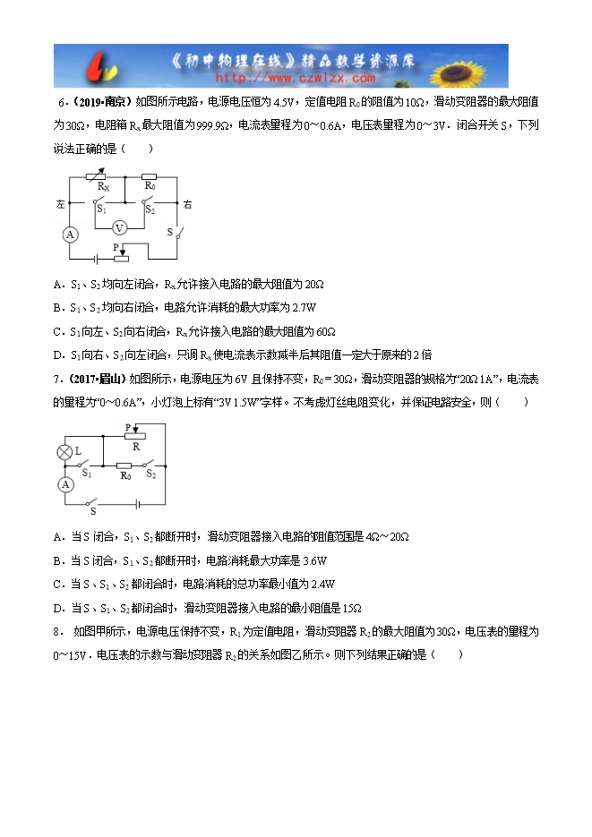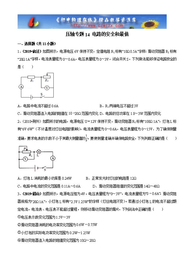 2020届九年级物理培优压轴题专练专题:14 电路的安全和最值