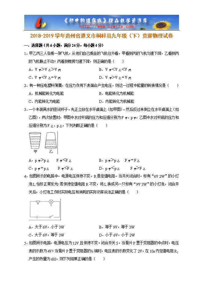 2018-2019学年贵州省遵义市桐梓县九年级(下)竞赛物理试卷(解析版)