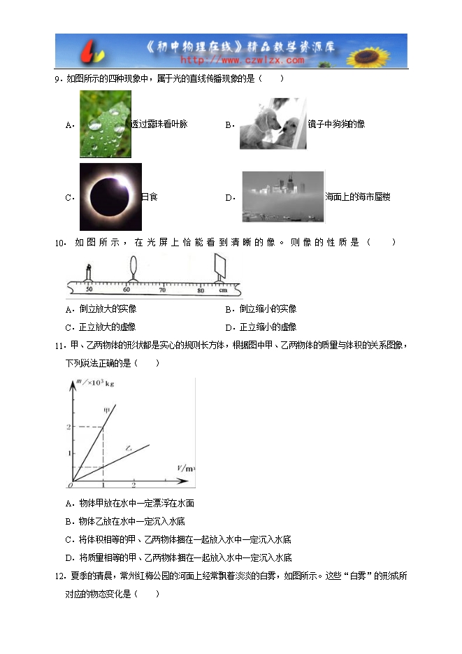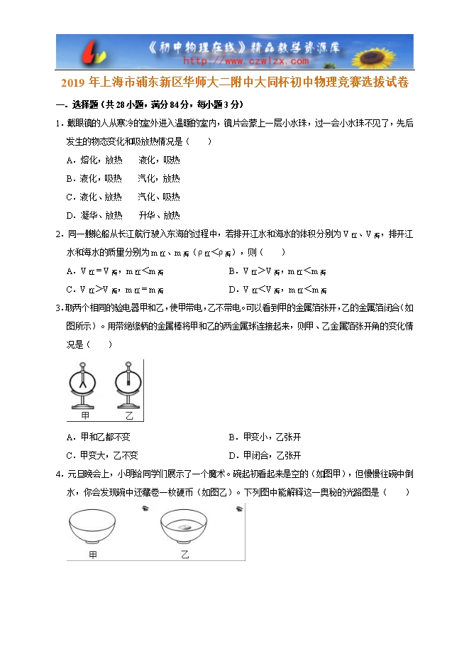 2019年上海市浦东新区华师大二附中大同杯初中物理竞赛选拔试卷(word解析版)