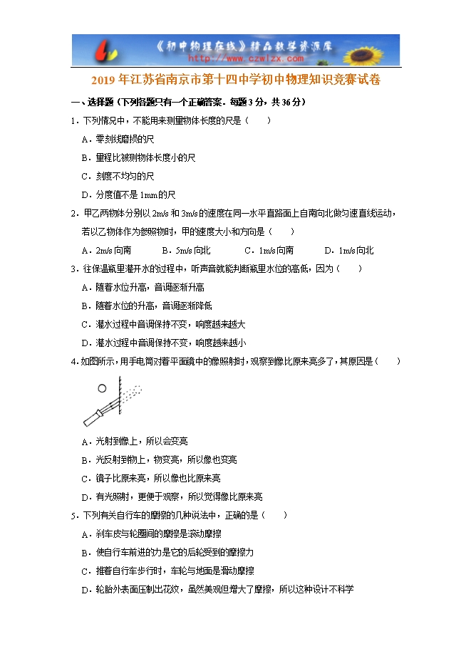 【内容简介】2019年江苏省南京市第十四中学初中物理知识竞赛试卷(word解析版)