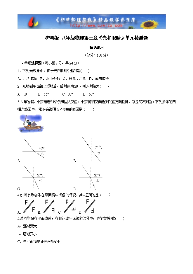 - 512023秋沪粤版八年级物理《第三章 光和眼睛》综合素质评价试题及答案