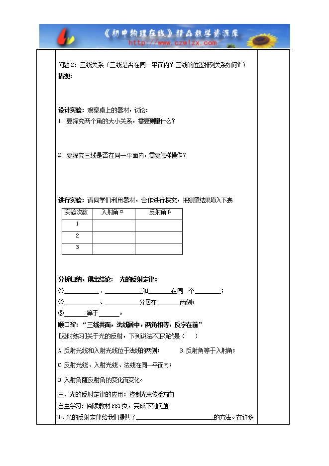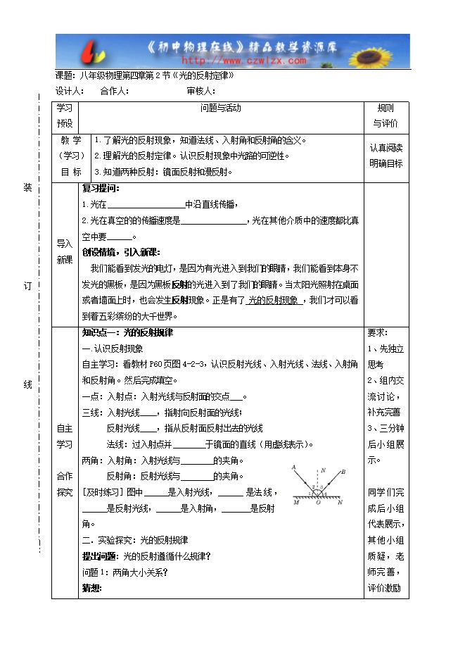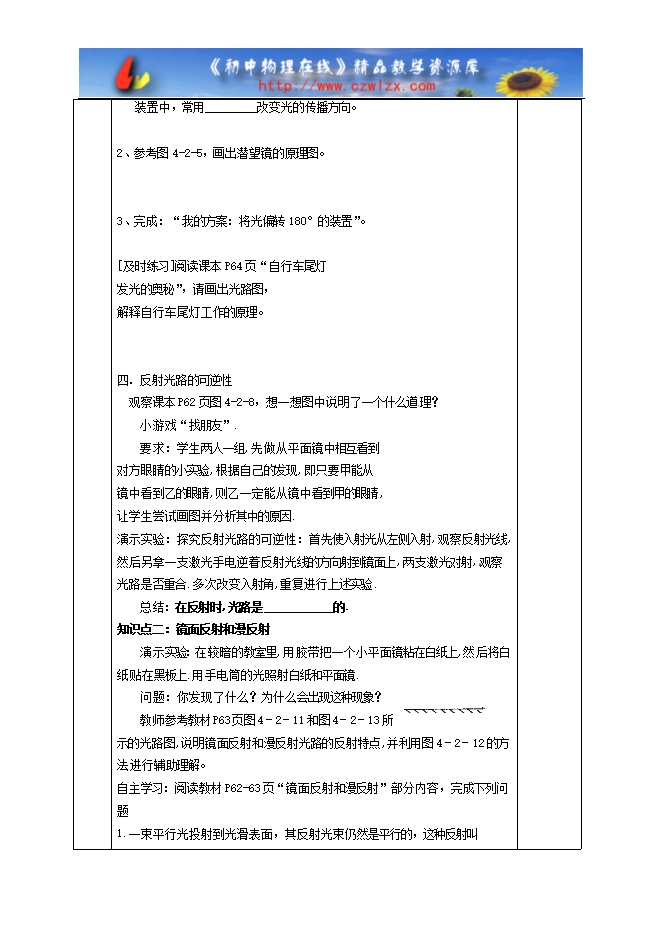 教科版八年级物理上册学案:第四章 第2节《光的反射定律》(含答案)