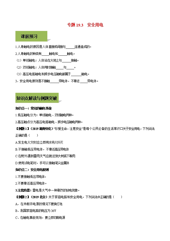 【内容简介】2019-2020学年九年级全一册物理精讲精练(人教版):专题19.3 安全用电(原卷版和解析版)