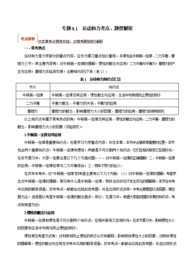 【内容简介】【迎战中考】2020年物理一轮考点题型解密与检测专题:8.运动和力(考点、题型解密 达标检测试卷)