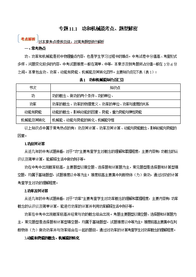 【内容简介】【迎战中考】2020年物理一轮考点题型解密与检测专题:11.功和机械能(考点、题型解密 达标检测试卷)