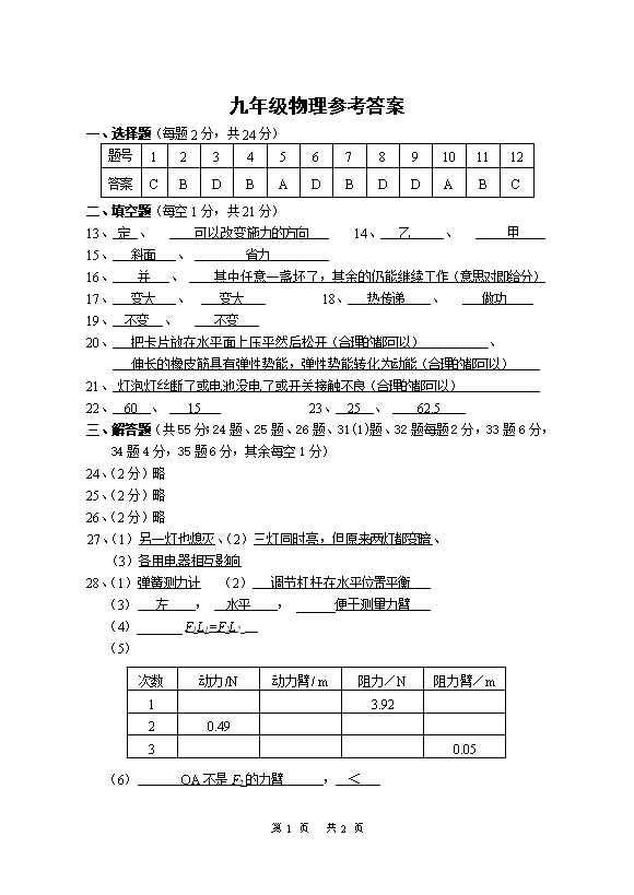 无锡市新区2009-2010学年第一学期期中考试九年级物理试卷及答案