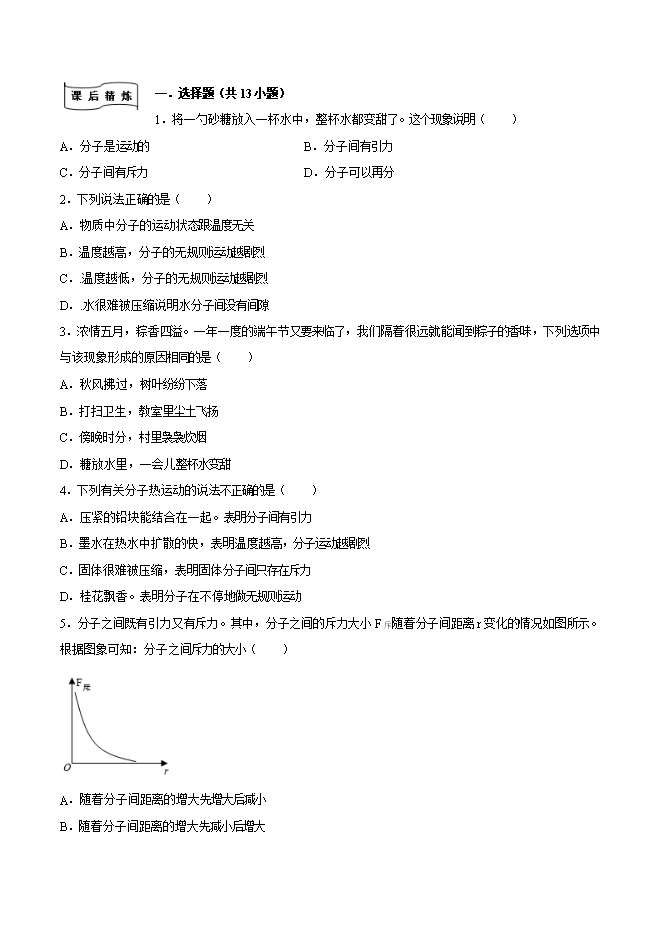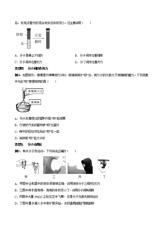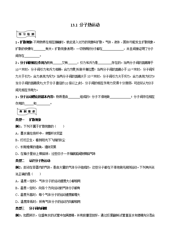 【内容简介】1、扩散现象:不同物质在相互接触时,彼此进入对方的现象叫扩散。气体、液体、固体均能发生扩散现象。扩散的快慢与 温度 有关。扩散现象表明:一切物质的分子都在不停地做无规则热运动 ,并且间接证明了分子间存在 间隙 。2、分子间的相互作用力既有 引力 又有 斥力 ,引力和斥力是 同时存在的。当两分子间的距离等于10-10米时,分子间引力和斥力相等,合力为零,叫做平衡位置;当两分子间的距离小于10-10米时,分子间斥力大于引力,合力表现为斥力;当两分子间的距离大于10-10米时,分子间引力大于斥力,合力表现为引力;当分子间的距离很大(大于分子直径的10倍以上)时,分子间的相互作用力变得十分微弱,可近似认为分子间无相互作用力。3、分子运动理论的基本内容:物质是由 分子 组成的;分子不停地做 无规则热运动 ;分子间存在相互作用的 引力 和 斥力 。 类型一 扩散现象例1.下列不属于扩散现象的( )A.墨水滴在烧杯中,使整杯水变蓝B.打扫卫生,看到阳光下飞扬的灰尘 C.长期堆煤的墙角,墙体变黑D.在箱子里放上樟脑球,过些日子一开箱就能闻到樟脑气味【答案】B。【解析】A、墨水滴入热水后,由于分子的运动很快将整杯水都变成蓝色,说明分子在不停地运动,属于扩散现象,故A不符合题意;B、打扫卫生时看到飞扬的尘土,是固体颗粒在运动,属于机械运动,不属于扩散现象,故B符合题意;C、长期堆煤的墙角,墙体变黑,是煤分子进入到了墙体中,属于扩散现象,故C不符合题意;D、在箱子里放上樟脑球,过些日子一开箱就能闻到樟脑气味,是气味分子在运动,属于扩散现象,故D不符合题意。