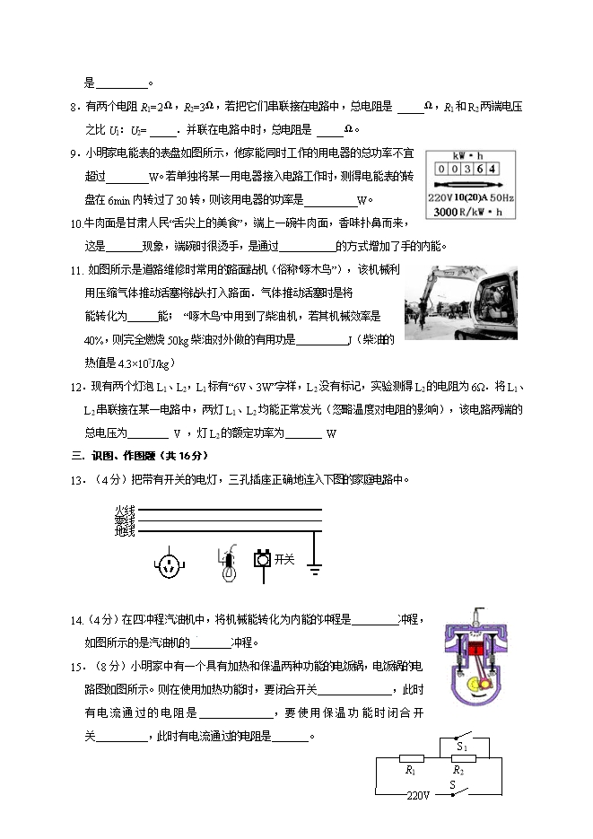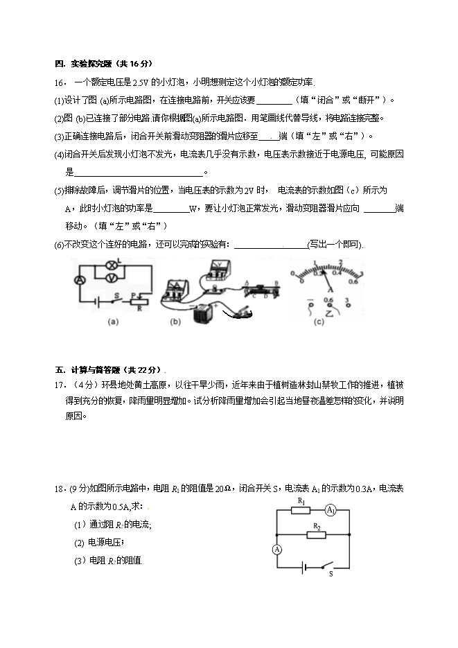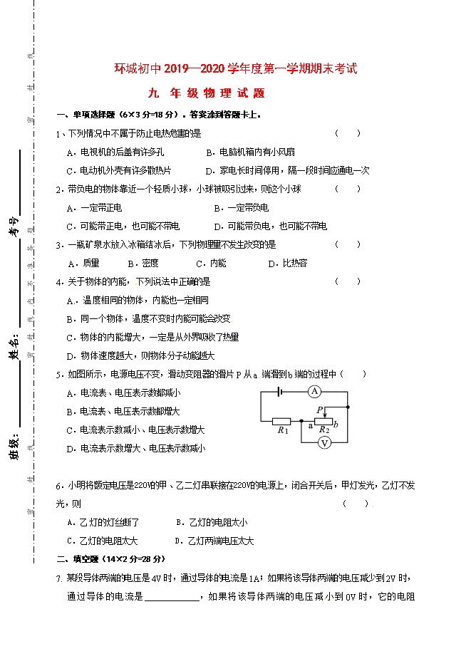 【内容简介】一、单项选择题(6×3分=18分)。答案涂到答题卡上。1、下列情况中不属于防止电热危害的是 ( )A.电视机的后盖有许多孔 B.电脑机箱内有小风扇C.电动机外壳有许多散热片 D.家电长时间停用,隔一段时间应通电一次2.带负电的物体靠近一个轻质小球,小球被吸引过来,则这个小球 ( )A.一定带正电 B.一定带负电[来源:Z&xx&k.Com]C.可能带正电,也可能不带电 D.可能带负电,也可能不带电3.一瓶矿泉水放入冰箱结冰后,下列物理量不发生改变的是 ( ) A.质量 B.密度 C.内能 D.比热容4.关于物体的内能,下列说法中正确的是 ( )A..温度相同的物体,内能也一定相同B.同一个物体,温度不变时内能可能会改变C.物体的内能增大,一定是从外界吸收了热量D.物体速度越大,则物体分子动能越大5.如图所示,电源电压不变,滑动变阻器的滑片P从a 端滑到b端的过程中( )A.电流表、电压表示数都减小B.电流表、电压表示数都增大C.电流表示数减小、电压表示数增大D.电流表示数增大、电压表示数减小 6.小明将额定电压是220V的甲、乙二灯串联接在220V的电源上,闭合开关后,甲灯发光,乙灯不发光,则 ( )A.乙灯的灯丝断了 B.乙灯的电阻太小 C.乙灯的电阻太大 D.乙灯两端电压太大二、填空题(14×2分=28分)7. 某段导体两端的电压是4V时,通过导体的电流是1A;如果将该导体两端的电压减少到2V时,通过导体的电流是 ,如果将该导体两端的电压减小到0V时,它的电阻是 。