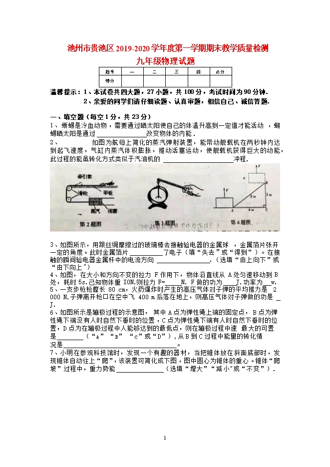 安徽省池州市贵池区2019-2020学年度第一学期期末物理教学质量检测试题及答案