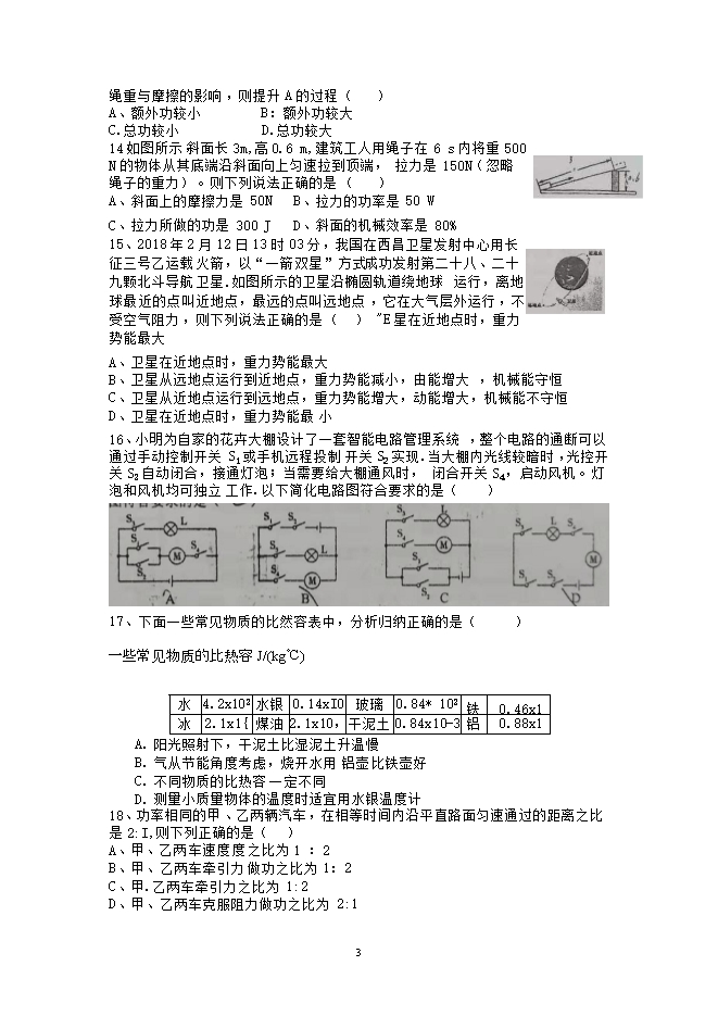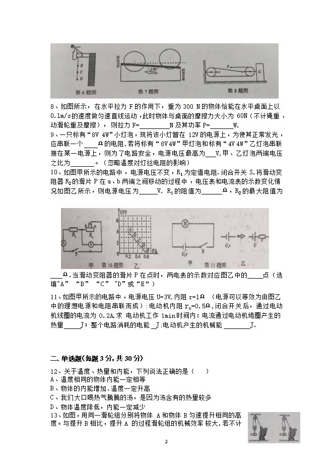 【内容简介】一、填空題(每空1分,共23分)1、 蜥蜴是冷血动物,需要通过晒太阳使自己的体温升高到一定值才能活动,蝴蜴晒太阳是通过 改变物体的内能.2、 如图为航母上简化的蒸汽弹射装置,能带动舰载机在两秒钟内达到起飞速度,气缸内蒸汽体积膨胀,推动活塞运动,使舰载机获得巨大的动能,此过程的能虽转化方式类似于汽油机的 冲程. 3、如图所示,用跟丝绸摩擦过的玻璃棒去接触验电器的金属球,金属箔片张开一定的角度。此时金属箔片 了电子(填“失去”或“得到”)。在接触的瞬间验电器金属杆中的电流方向 .(选填“由上向下”或“由下向上")4、如图,在大小和方向不变的拉力F作用下,物体沿直线从A处匀速移动到B处,耗时5s.己知物体重I0N,则拉力F= N, F做的功为 J,功率为 w.5、一支步枪枪膛长80 cm,火药爆炸时产生的高压气体对子弹的平均推力是2 000 N,子弹离开枪口在空中飞400 m后落在地上,则髙压气体对子弹做的功是 J.6、如图所示是蹦极过程的示意图,其中A点为弹性绳上端的固定点,B点为弹性绳下端没有人时自然下垂时的位置,C点为弹性绳下端有人时自然下垂时的位置,D点为在蹦极过程中人能够达到的最低点,则在蹦极过程中速最大的可置 是 (“a” “b” “c”或“D”),从B到C过程中能量的转化情况是 。7、小明在参观科技馆时,发现一个有趣的器材,当把锥体放在斜面底部时,发现锥体自动往上“爬”,该装置可简化成下图,图中圆心为锥体的重心。锥体“爬坡”过程中,重力势能 (选填“增大”“减小"或“不变”).