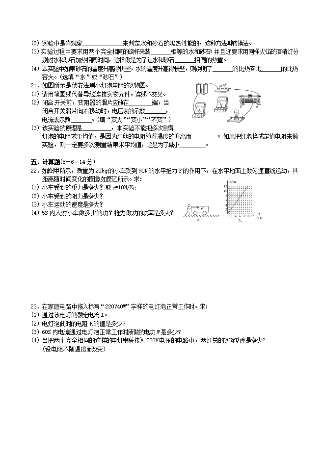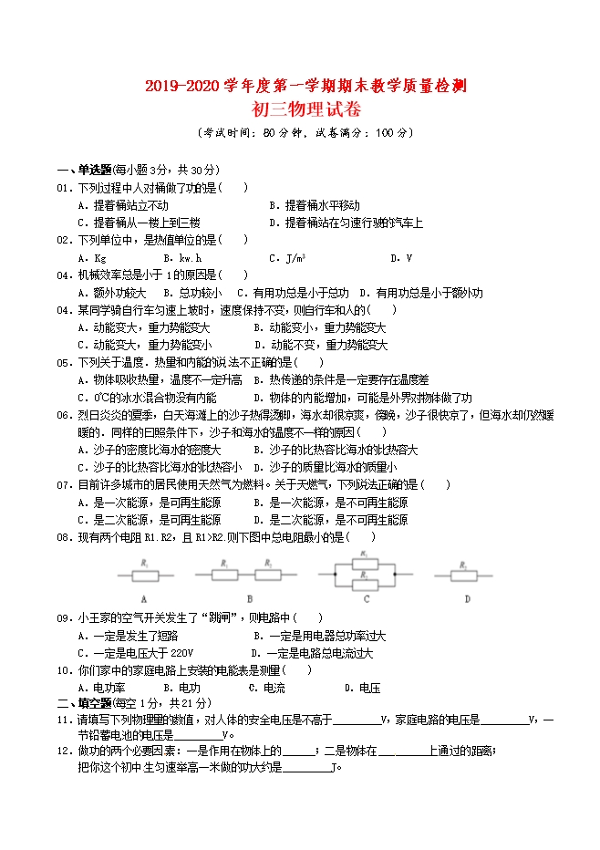 【内容简介】广东省东莞虎门汇英学校2020届九年级上学期期末考试物理试题(沪粤版无答案)