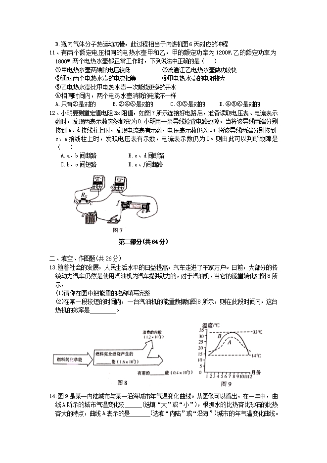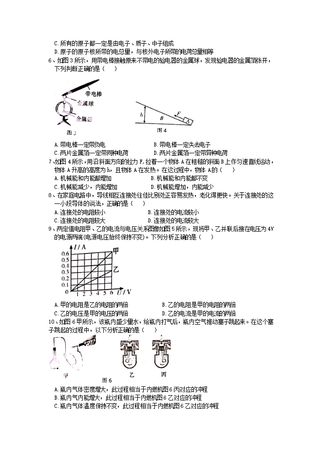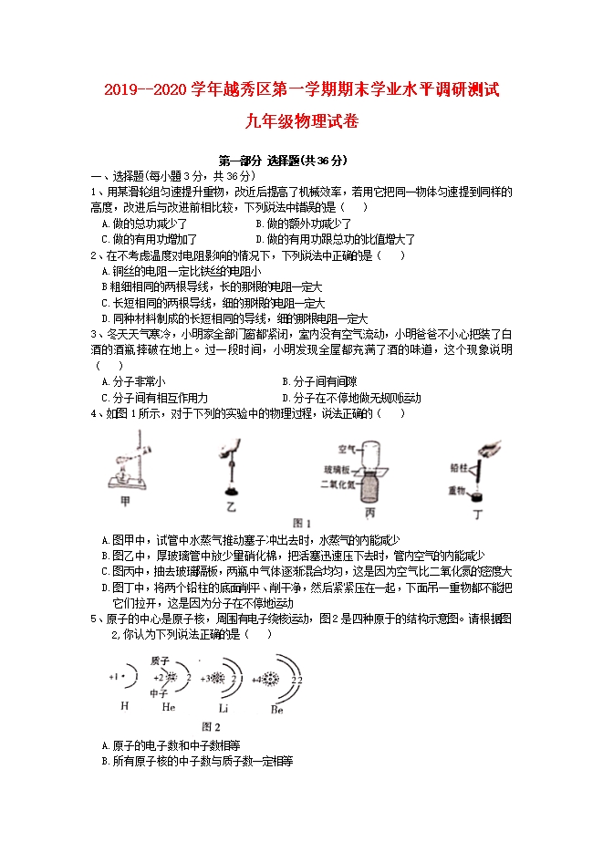 【内容简介】第一部分 选择题(共36分)一、选择题(每小題3分,共36分)1、用某滑轮组匀速提升重物,改近后提高了机械效率,若用它把同一物体匀速提到同样的高度,改进后与改进前相比较,下列说法中错误的是( )A.做的总功减少了 B.做的额外功减少了C.做的有用功增加了 D.做的有用功跟总功的比值增大了2、在不考虑温度对电阻影响的情况下,下列说法中正确的是( )A.铜丝的电阻一定比铁丝的电阻小B粗细相同的两根导线,长的那根的电阻一定大C.长短相同的两根导线,细的那根的电阻一定大D.同种材料制成的长短相同的导线,细的那根电阻一定大3、冬天天气寒冷,小明家全部门窗都紧闭,室内没有空气流动,小明爸爸不小心把装了白酒的酒瓶摔破在地上。过一段时间,小明发现全屋都充满了酒的味道,这个现象说明( )A.分子非常小 B.分子间有间隙C.分子间有相互作用力 D.分子在不停地做无规则运动4、如图1所示,对于下列的实验中的物理过程,说法正确的( ) A.图甲中,试管中水蒸气推动塞子冲出去时,水蒸气的内能减少B.图乙中,厚玻璃管中放少量硝化棉,把活塞迅速压下去时,管内空气的内能减少C.图丙中,抽去玻璃隔板,两瓶中气体逐渐混合均匀,这是因为空气比二氧化氮的密度大D.图丁中,将两个铅柱的底面削平、削干净,然后紧紧压在一起,下面吊一重物都不能把 它们拉开,这是因为分子在不停地运动5、原子的中心是原子核,周围有电子绕核运动,图2是四种原于的结构示意图。请根据图2,你认为下列说法正确的是( )